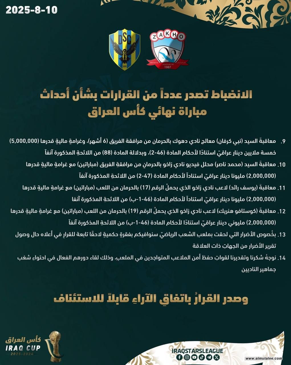 أصدرت لجنة الانضباط في الاتحاد العراقي لكرة القدم، اليوم الأحد، عدة قرارات بشأن أحداث مباراة نهائي كأس العراق للموسم 2024-2025 التي أقيمت على ملعب الشعب بين فريقي زاخو ودهوك.