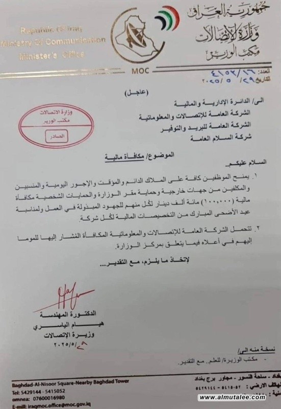 هەیام یاسری، وەزیری پەیوەندییەكانی عێراق لەنووسراوێکدا کەدەستی موتەڵع کەوتووە بڵاویکردەووە، سەرجەم فەرمانبەرانی وەزارەتەكە (فەرمانبەری هەمیشەیی، گرێبەست و ئەوانەی بە كرێی رۆژانە كاردەكەن، هاوكات كارمەندانی پاراستنی بارەگای وەزارەت، بڕی ١٠٠ هەزار دیناری جەژنانەیان پێدەدرێت.