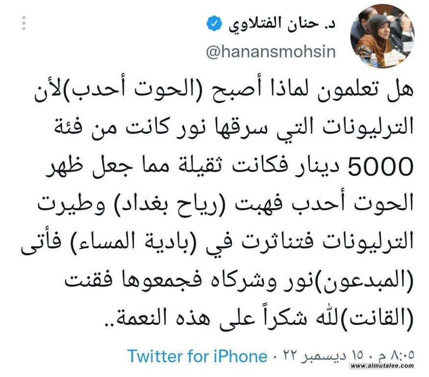 وكتبت الفتلاوي في تدوينة: "هل تعلمون لماذا أصبح (الحوت أحدب) لأن الترليونات التي سرقها نور كانت من فئة 5000 دينار فكانت ثقيلة مما جعل ظهر الحوت أحدب فهبت الترليونات فتناثرت في (بادية المساء) فأتى (المبدعون) نور وشركاه فجمعوها فقنت (القانت)".