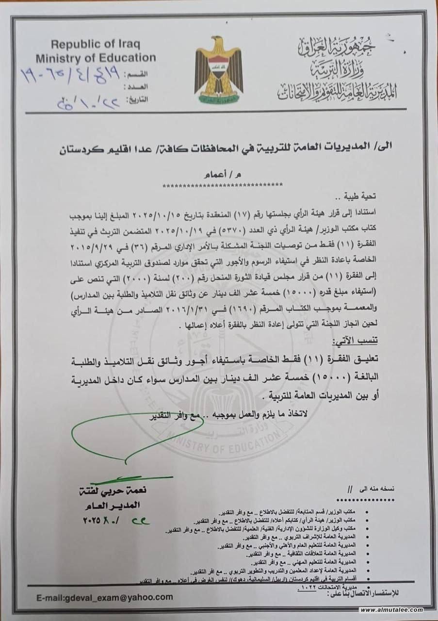 پەروەردە ڕێنمایی ڕاگرتنی کرێی بەڵگەنامەکانی گواستنەوەی قوتابیان لە نێوان بەڕێوەبەرایەتییەکان دەدات