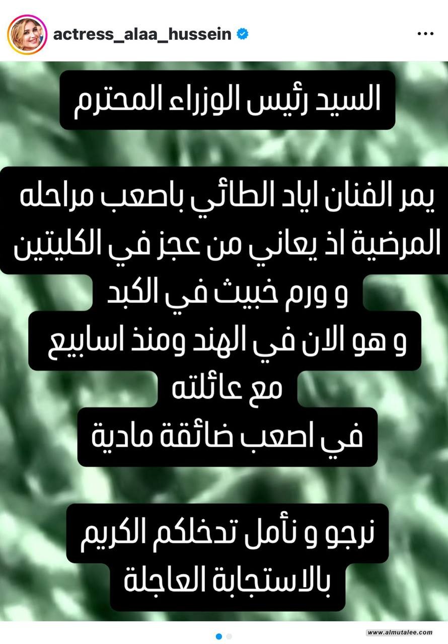 ناشدت الممثلة آلاء حسين، الخميس، رئيس الوزراء محمد شياع السوداني للتدخل عاجلاً في حالة الفنان "أياد الطائي" الذي يمر بضائقة مادية وبظروف صحية صعبة، ويرقد حالاً في الهند بسبب عجز في كليتيه وورم خبيث بالكبد.
