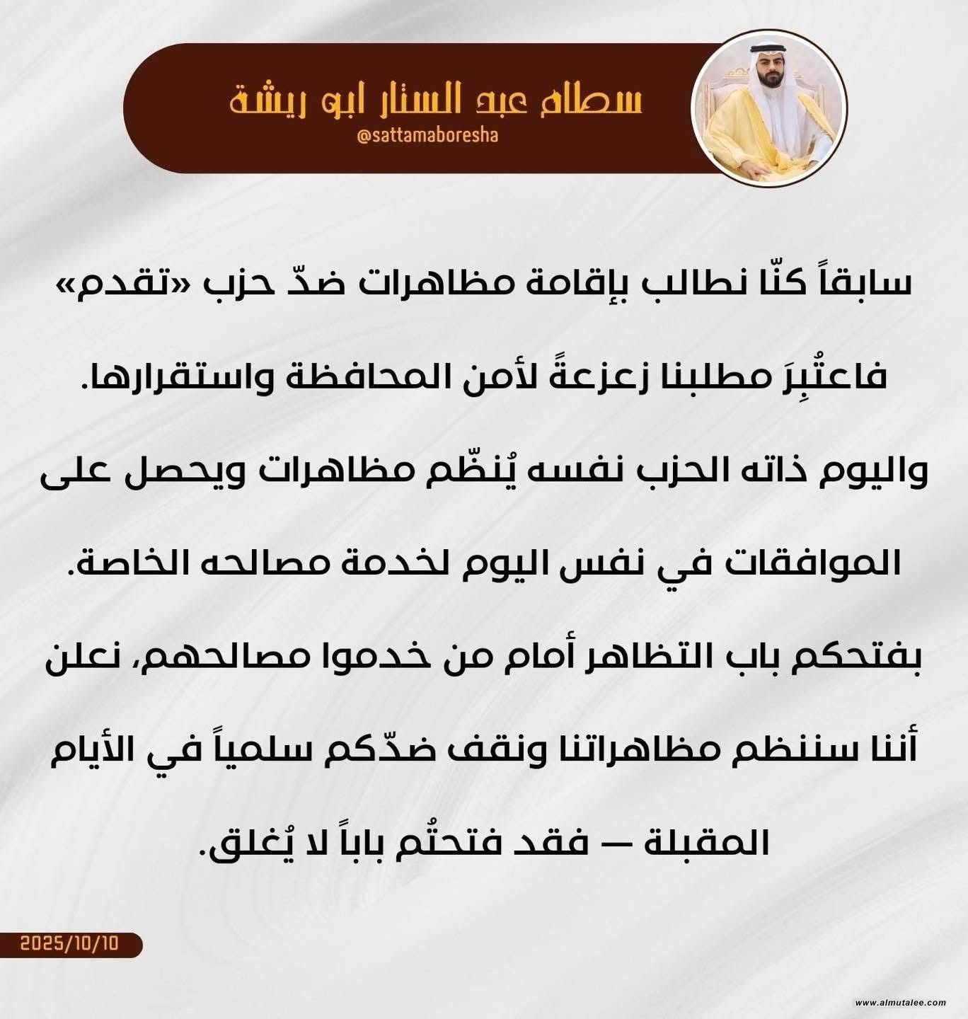 وقال أبو ريشة في منشور على حسابه بمنصة “إكس”، تابعته "المطلع"، إن:"حزب تقدم الذي اعتبر في وقت سابق أن الدعوات إلى التظاهر تُزعزع أمن المحافظة واستقرارها، أصبح اليوم هو من ينظم التظاهرات ويطلب الموافقات الرسمية لخدمة مصالحه الخاصة".