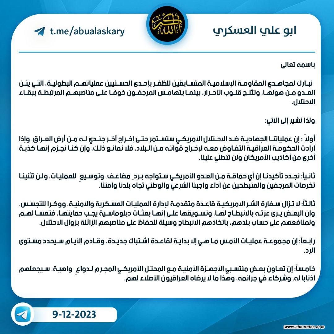 وأضاف العسكري في قناته على "تلغرام"، أن: "عملياتنا الجهاديـة ضـد الجيش الأمريكي ستستمر حتـى إخـراج آخـر جـنـدي لـه مـن أرض العراق، وإذا أرادت الحكومة العراقية التفاوض معـه لإخراج قواتـه مـن البلاد، فلا نمانع ذلك، وإن كنا نجزم إنها كذبة أخرى من أكاذيب الأمريكان ولن تنطلي علينا".