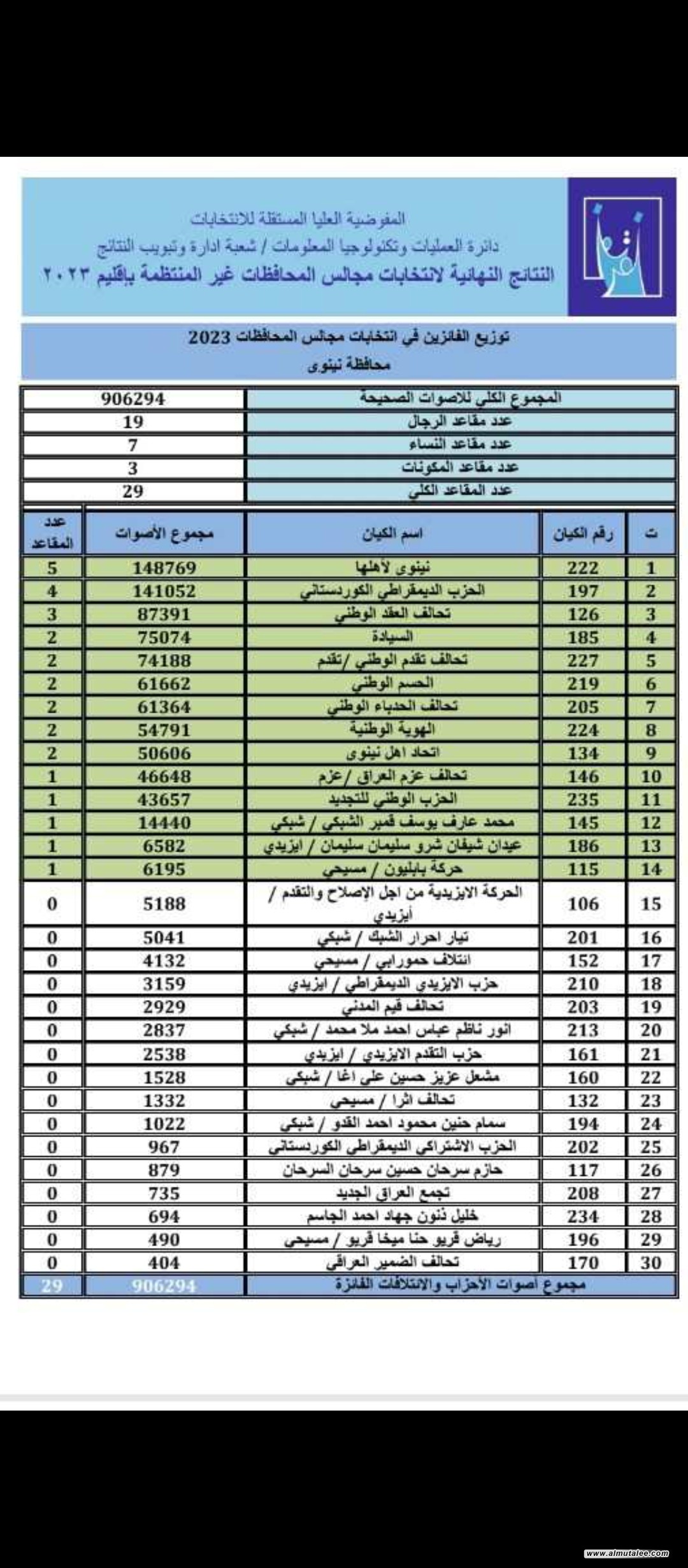 کۆمسیۆنی باڵای هەڵبژاردنەکان،ئەنجامی كۆتایی ژمارەی دەنگ و كورسی لایەنەكان لە پارێزگای نەینەوای ئاشکراکرد.