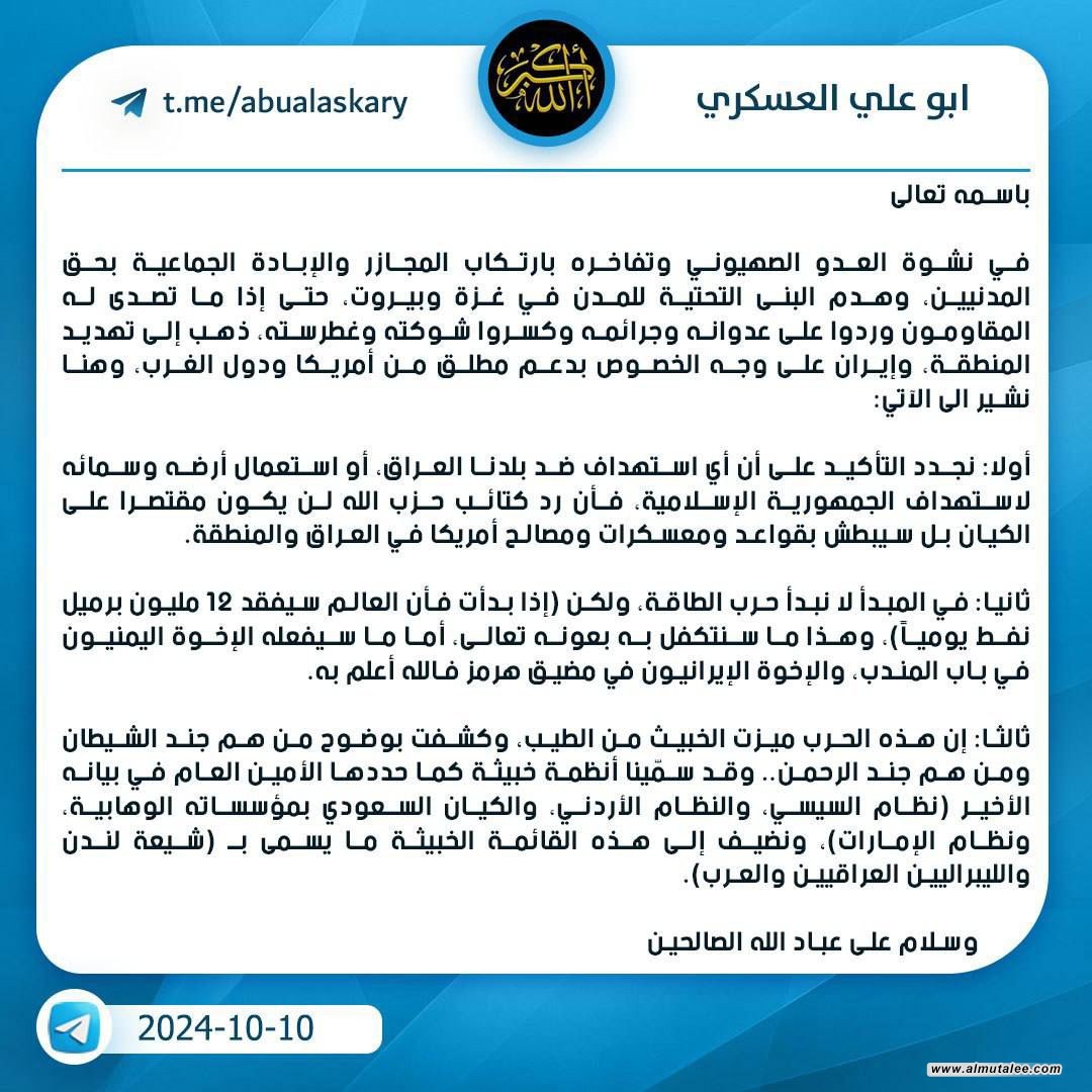 وقال العسكري في تغريدة على منصة إكس تابعته وكالة"المطلع"،إنه"نجدد التأكيد على أن أي استهداف ضد بلدنا العراق، أو استعمال أرضه وسمائه لاستهداف الجمهورية الإسلامية، فأن رد كتائب حزب الله لن يكون مقتصرا على الكيان بل سيبطش بقواعد ومعسكرات ومصالح أمريكا في العراق والمنطقة".
