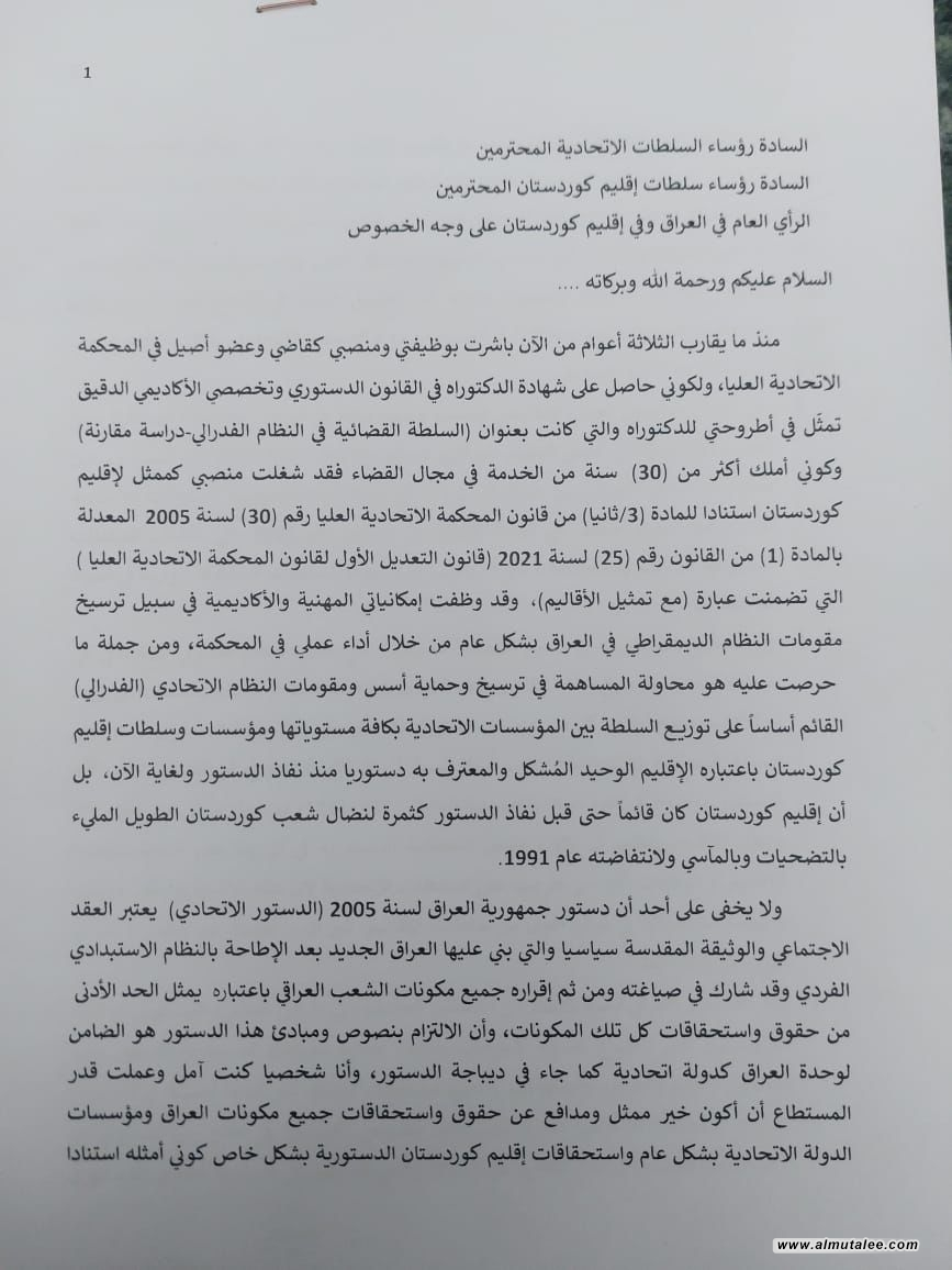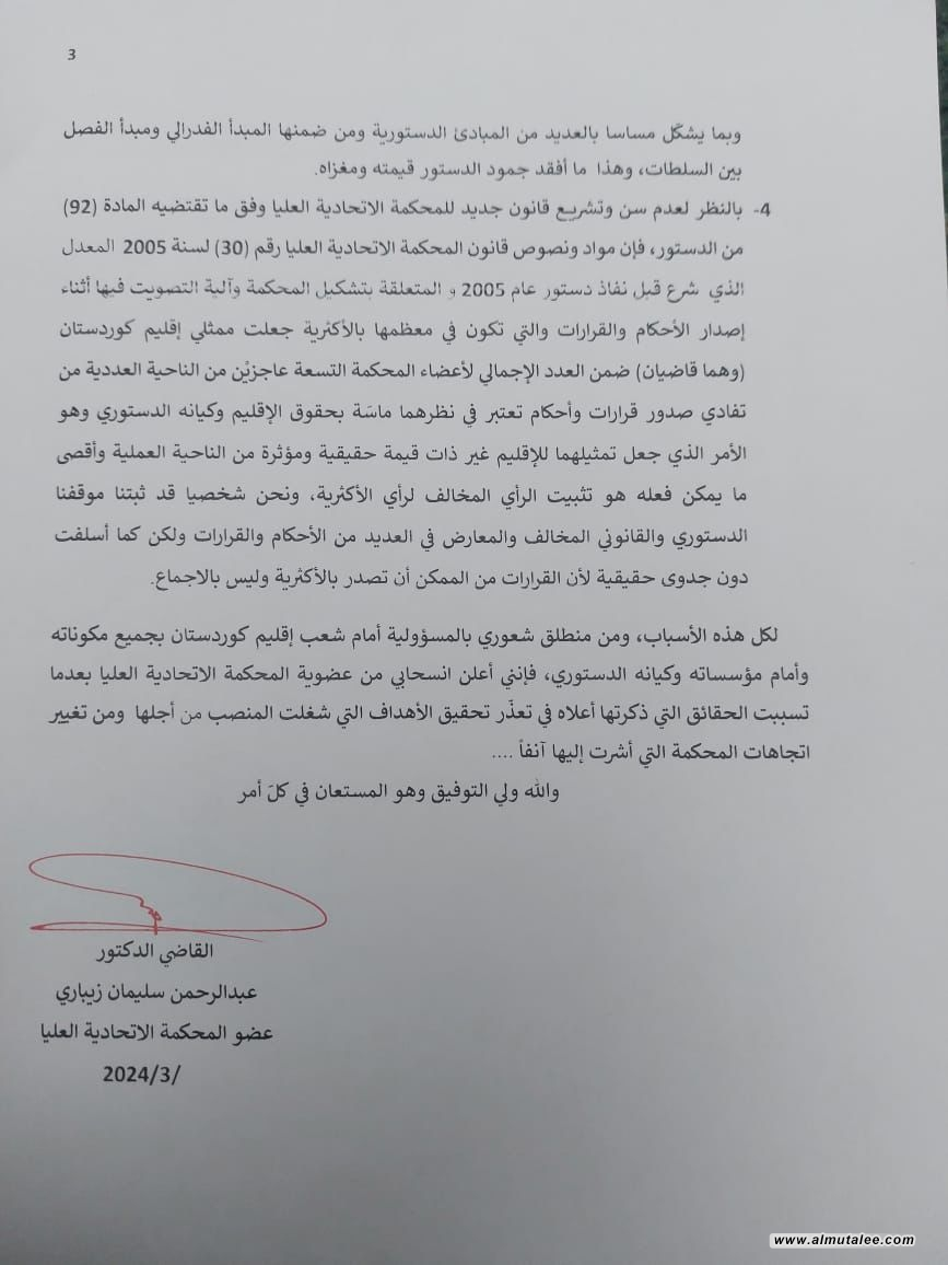 وفي وقت سابق من اليوم، اعلن عضو المحكمة الاتحادية العليا القاضي عبد الرحمن سليمان زيباري، انسحابه من عضوية المحكمة.