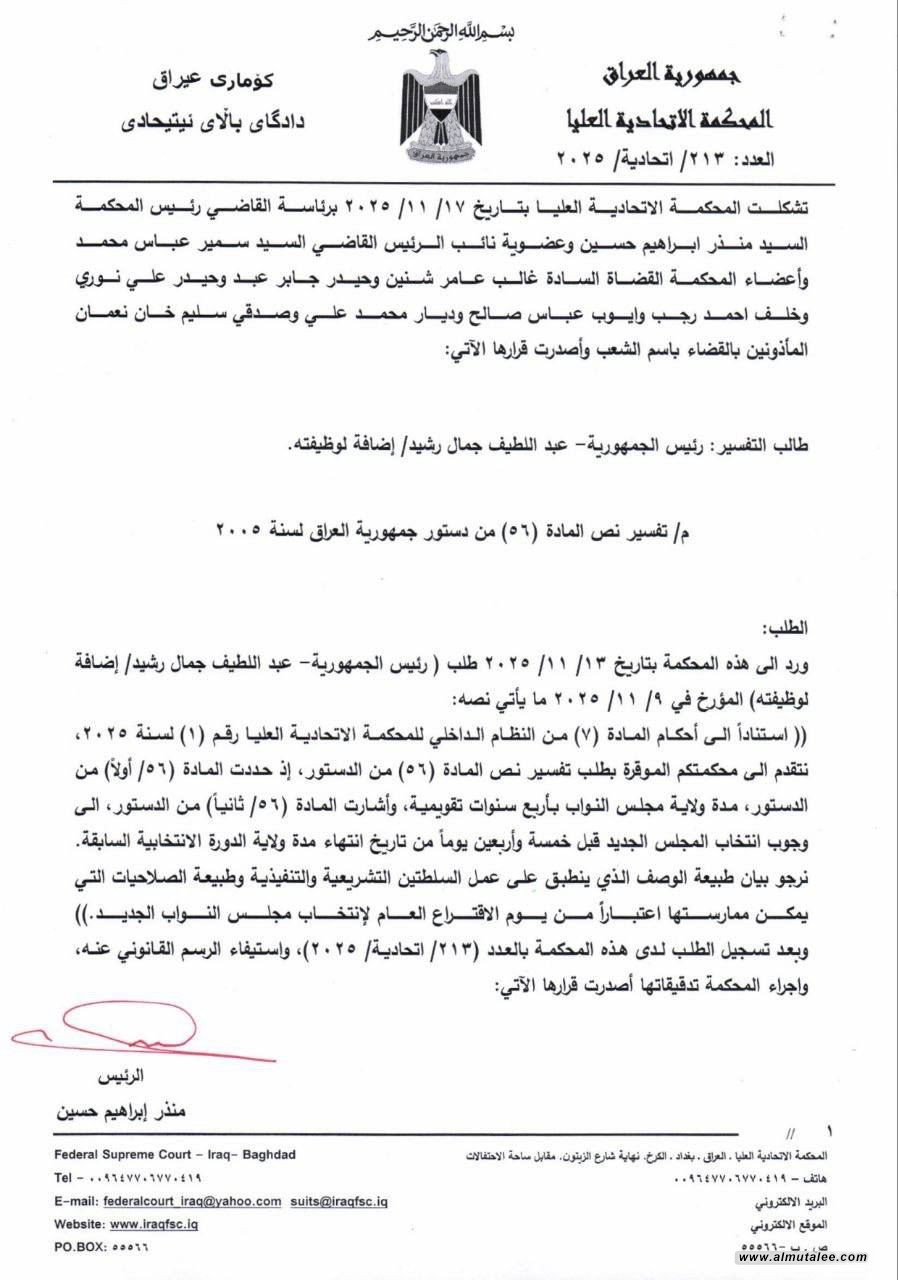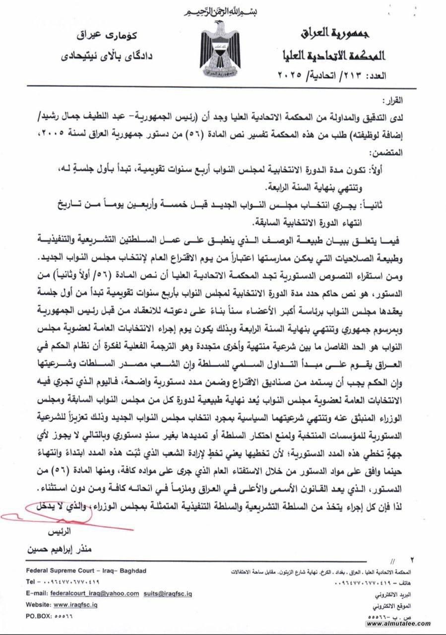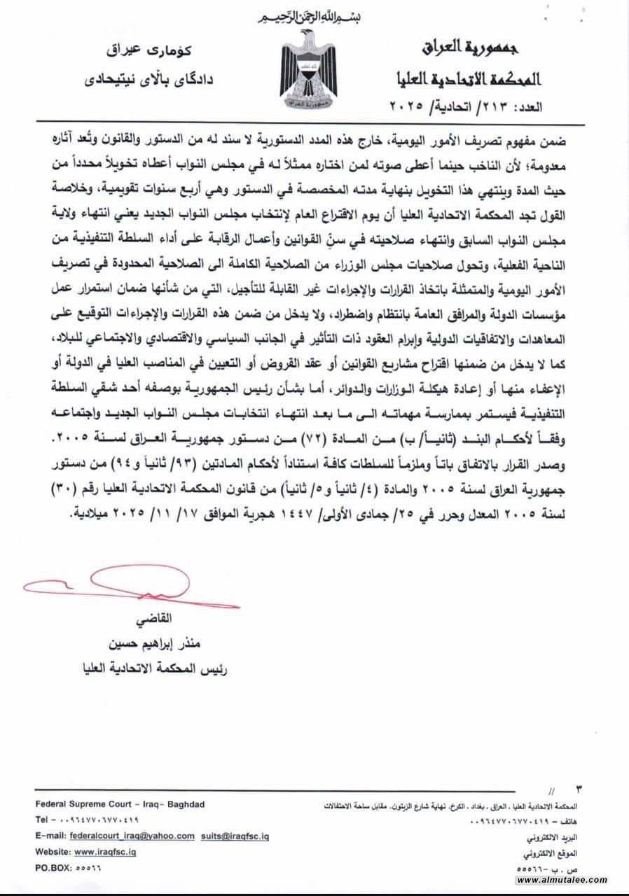 أصدرت المحكمة الاتحادية العليا، اليوم الاثنين، قراراً مهماً يقضي بإنهاء أعمال مجلس النواب الحالي وتحويل صلاحيات مجلس الوزراء " تصريف أعمال" محدودة الصلاحيات، فيما أكدت استمرار رئيس الجمهورية في ممارسة مهامه الدستورية دون أي تغيير.
