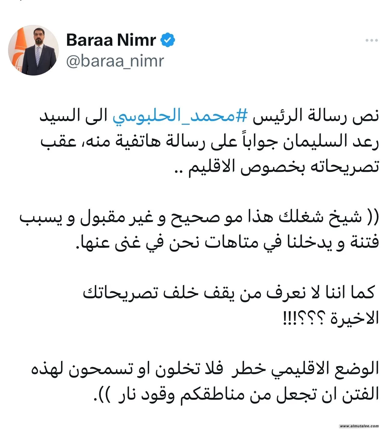 وقال عضو حزب تقدم براء النمر، عبر منصة "إكس": "نص رسالة الرئيس محمد الحلبوسي الى رعد السليمان جواباً على رسالة هاتفية منه، عقب تصريحاته بخصوص الاقليم: (شيخ شغلك هذا مو صحيح وغير مقبول ويسبب فتنة ويدخلنا في متاهات نحن في غنى عنها، كما اننا لا نعرف من يقف خلف تصريحاتك!!!الاخيرة ؟؟؟،