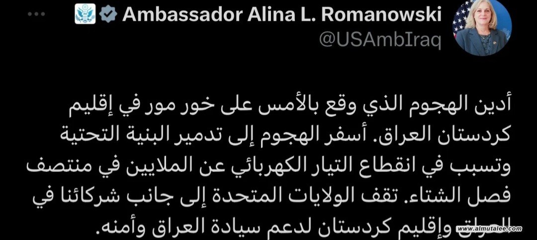 وقالت السفيرة، عبر منصة "إكس"وتابعتها "المطلع"، "أدين الهجوم الذي وقع بالأمس على خور مور في إقليم كردستان العراق، أسفر الهجوم إلى تدمير البنية التحتية وتسبب في انقطاع التيار الكهربائي عن الملايين في منتصف فصل الشتاء".