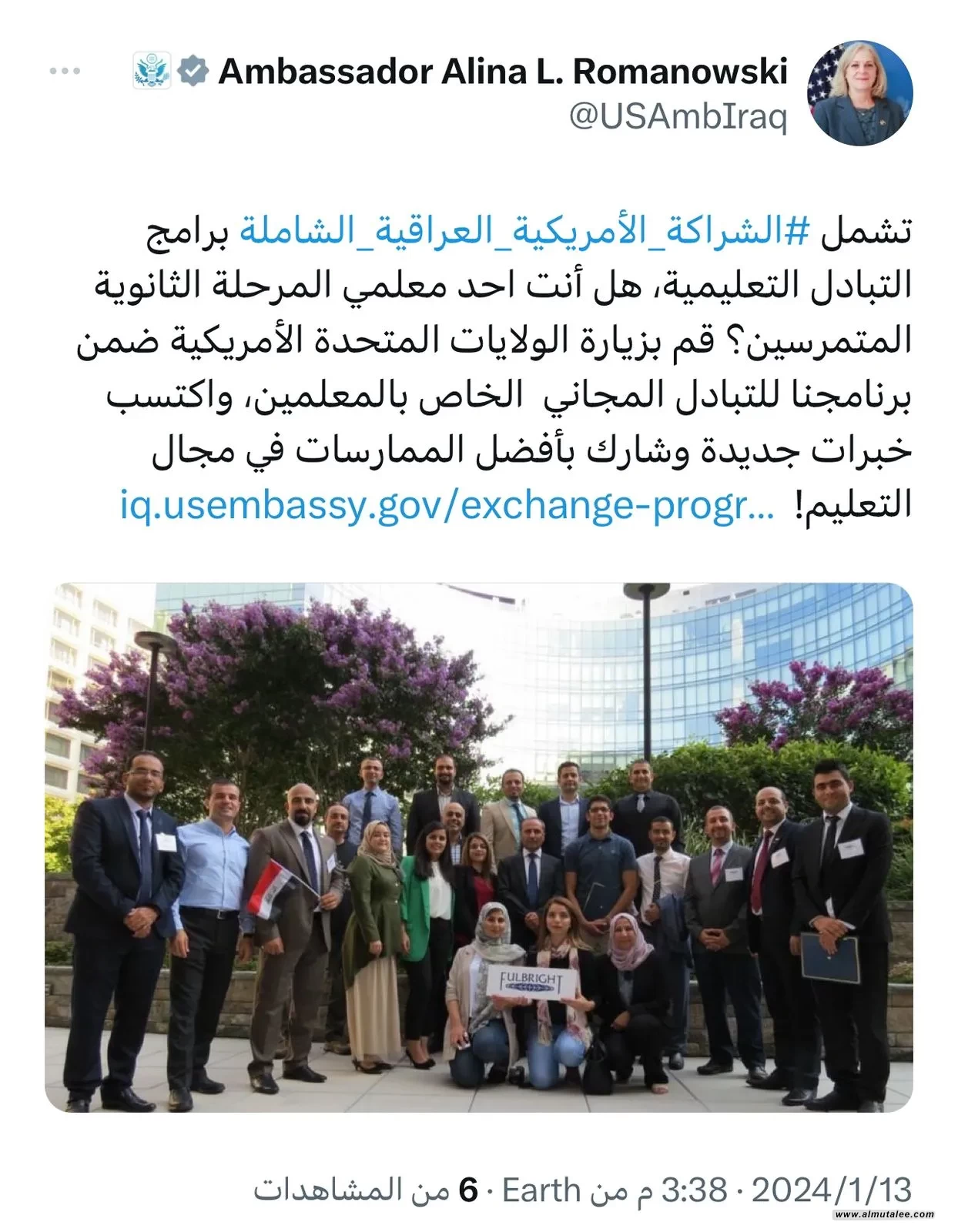 وقالت رومانسكي في تدوينة على صفحتها الشخصية وتابعتها "المطلع"، إن: "الشراكة الأمريكية العراقية الشاملة تشمل برامج التبادل التعليمية، هل أنت احد معلمي المرحلة الثانوية المتمرسين؟ قم بزيارة الولايات المتحدة الأمريكية ضمن برنامجنا للتبادل المجاني الخاص بالمعلمين، واكتسب خبرات جديدة وشارك بأفضل الممارسات في مجال التعليم".
