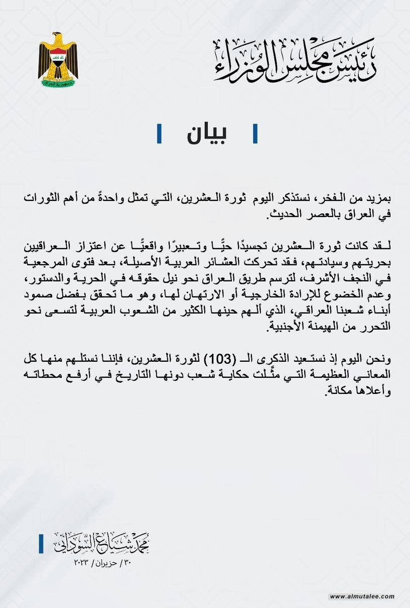 السوداني مستذكراً ثورة العشرين: تجسيد حي لاعتزاز العراقيين بحريتهم وسيادتهم