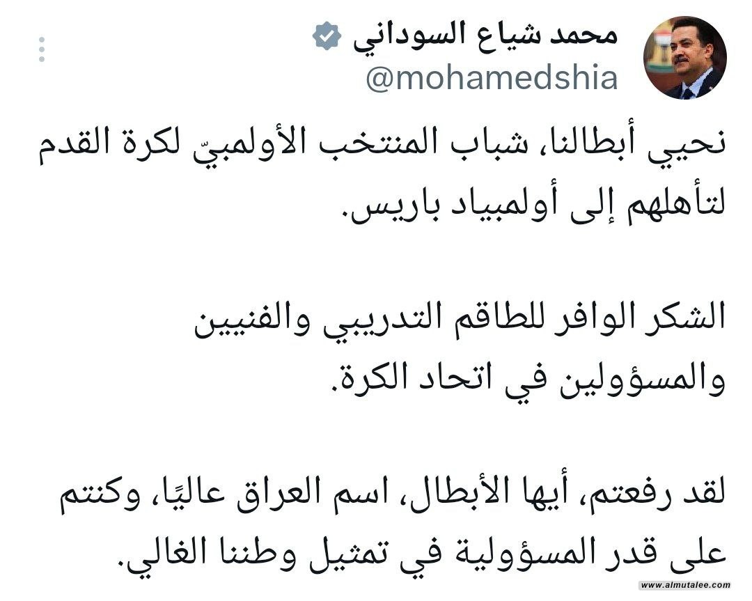 بارك رئيس مجلس الوزراء محمد شياع السوداني ،مساء اليوم الخميس،فوز المنتخب الأولومبي على إندونيسيا.