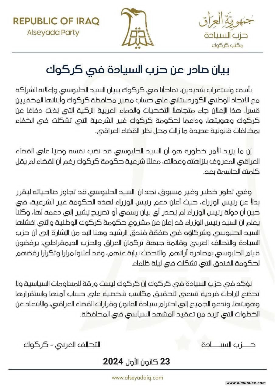 وذكر بيان صادر عن حزب السيادة في كركوك وتلقته "المطلع"، أنه:"بأسف واستغراب شديدين، تفاجأنا في كركوك ببيان الحلبوسي وإعلانه الشراكة مع الاتحاد الوطني الكردستاني على حساب مصير محافظة كركوك وأبنائها المخفيين قسراً".