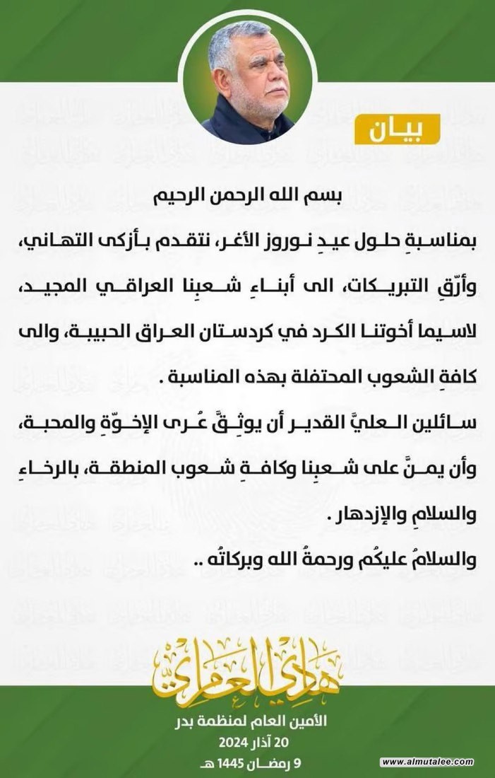 العامري مهنئاً بعيد نوروز: نتقدم بأزكى التهاني وأرق التبريكات لأبناء شعبنا