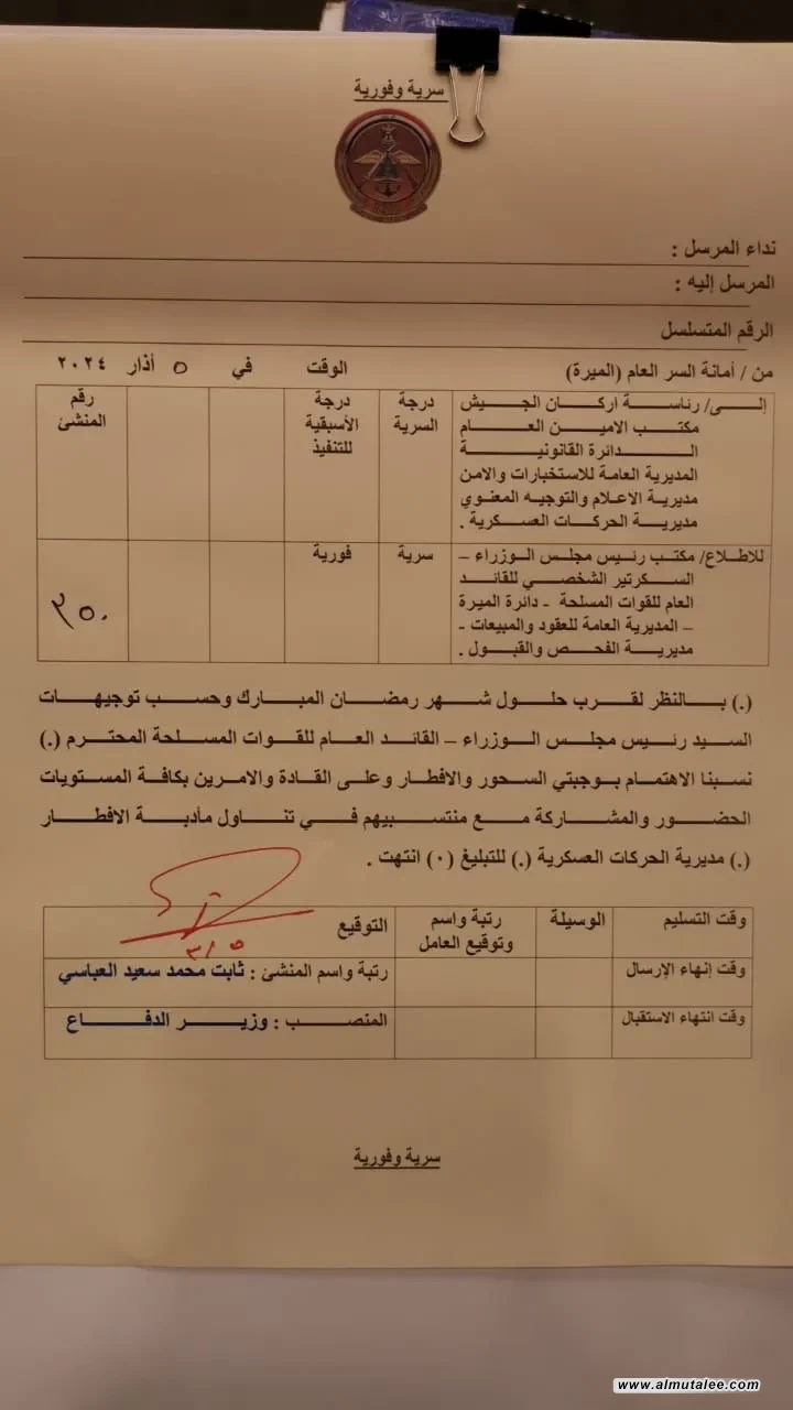 وجه وزير الدفاع ثابت العباسي، بالاهتمام بوجبتي السحور و الإفطار للقوات المسلحة ومشاركة القادة المأدبة مع منتسبيهم.