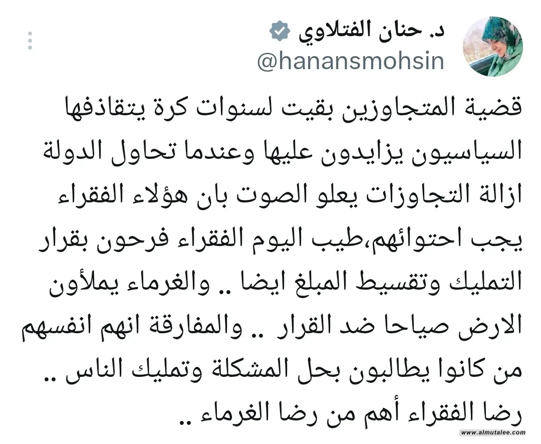 وقالت الفتلاوي في تغريدة عبر منصة إكس وتابعتها "المطلع"، إن:"قضية المتجاوزين بقيت لسنوات بمثابة "كرة" يتقاذفها السياسيون"، مضيفة أن:"محاولات الدولة لإزالة هذه التجاوزات غالباً ما تواجه اعتراضات بحجة أن هؤلاء من الفقراء ويجب احتواؤهم".