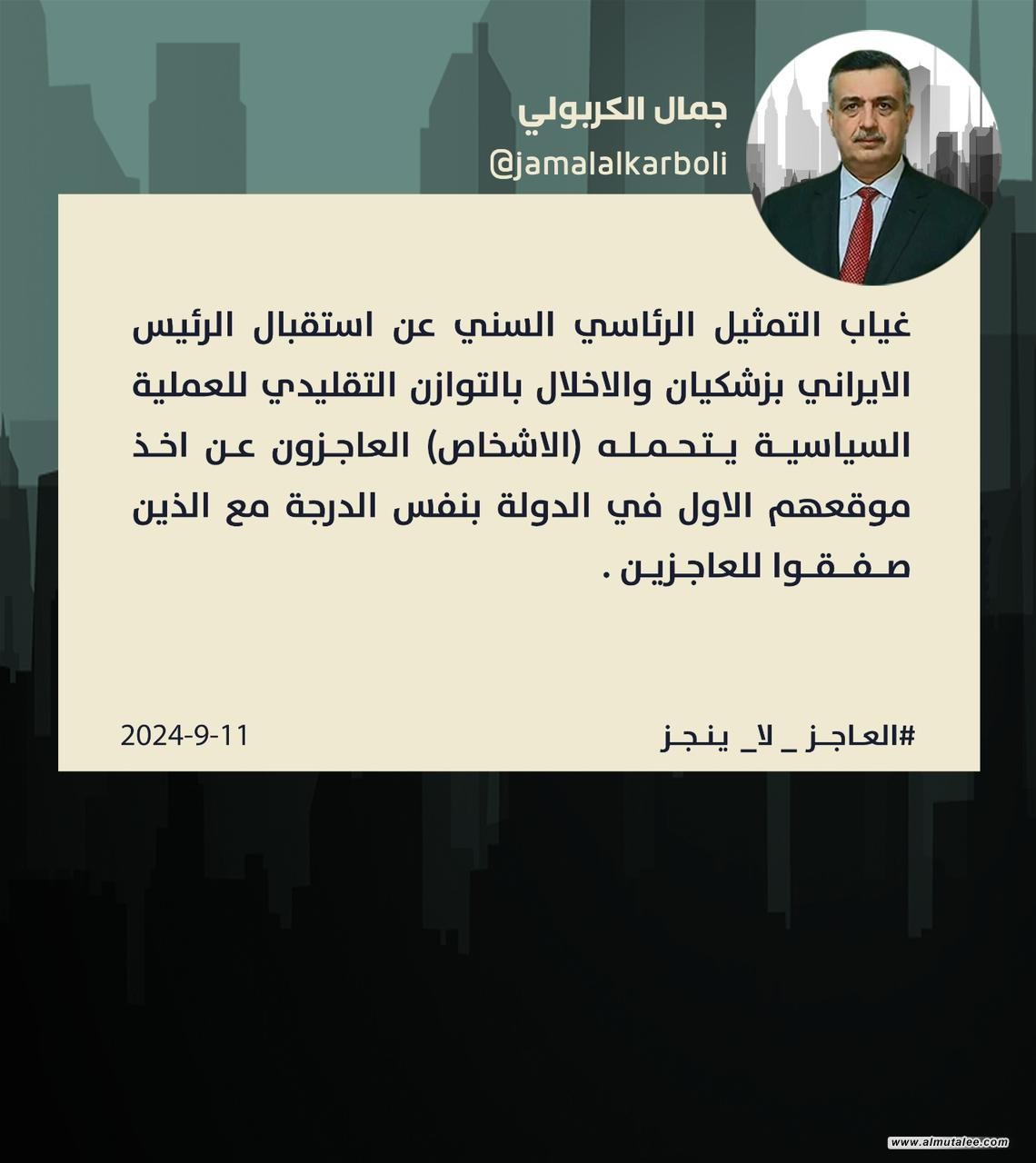 وقال الكربولي في تدوينة على منصة X وتابعتها "المطلع"، إن:"غياب التمثيل الرئاسي السني عن استقبال الرئيس الايراني بزشكيان والاخلال بالتوازن التقليدي للعملية السياسية يتحمله (الأشخاص) العاجزون عن أخذ موقعهم الأول في الدولة بنفس الدرجة مع الذين صفقوا للعاجزين".