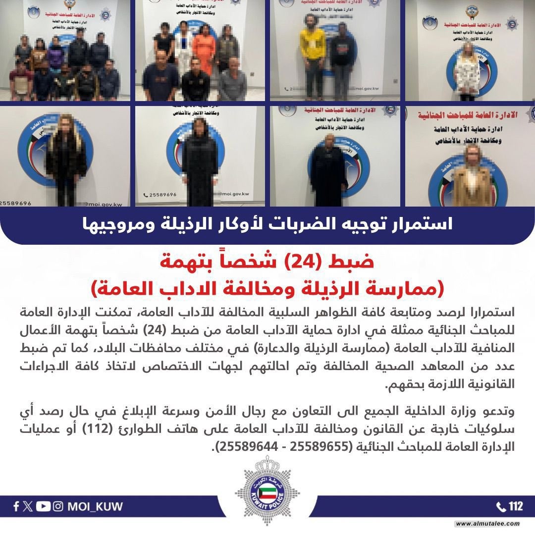 اعلنت وزارة الداخلية الكويتية، إلقاء القبض على "24" رجلاً وامرأةً بتهمة ممارسة الرذيلة والدعارة.