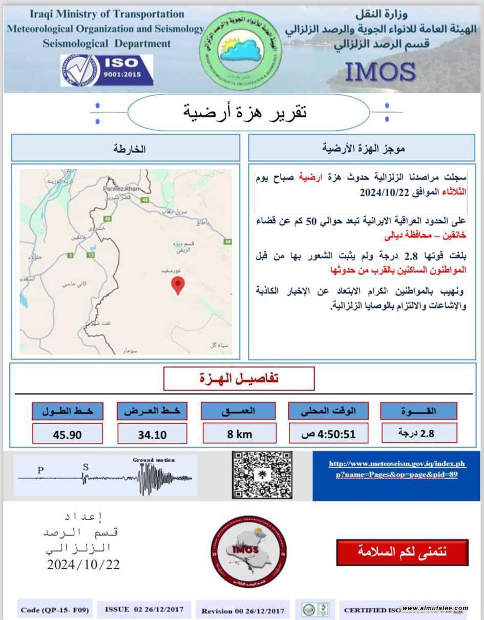 اعلنت وزارة النقل ،اليوم الثلاثاء، عن تسجيل هزة أرضية على الحدود العراقية الإيرانية بقوة 2.8 درجة.
