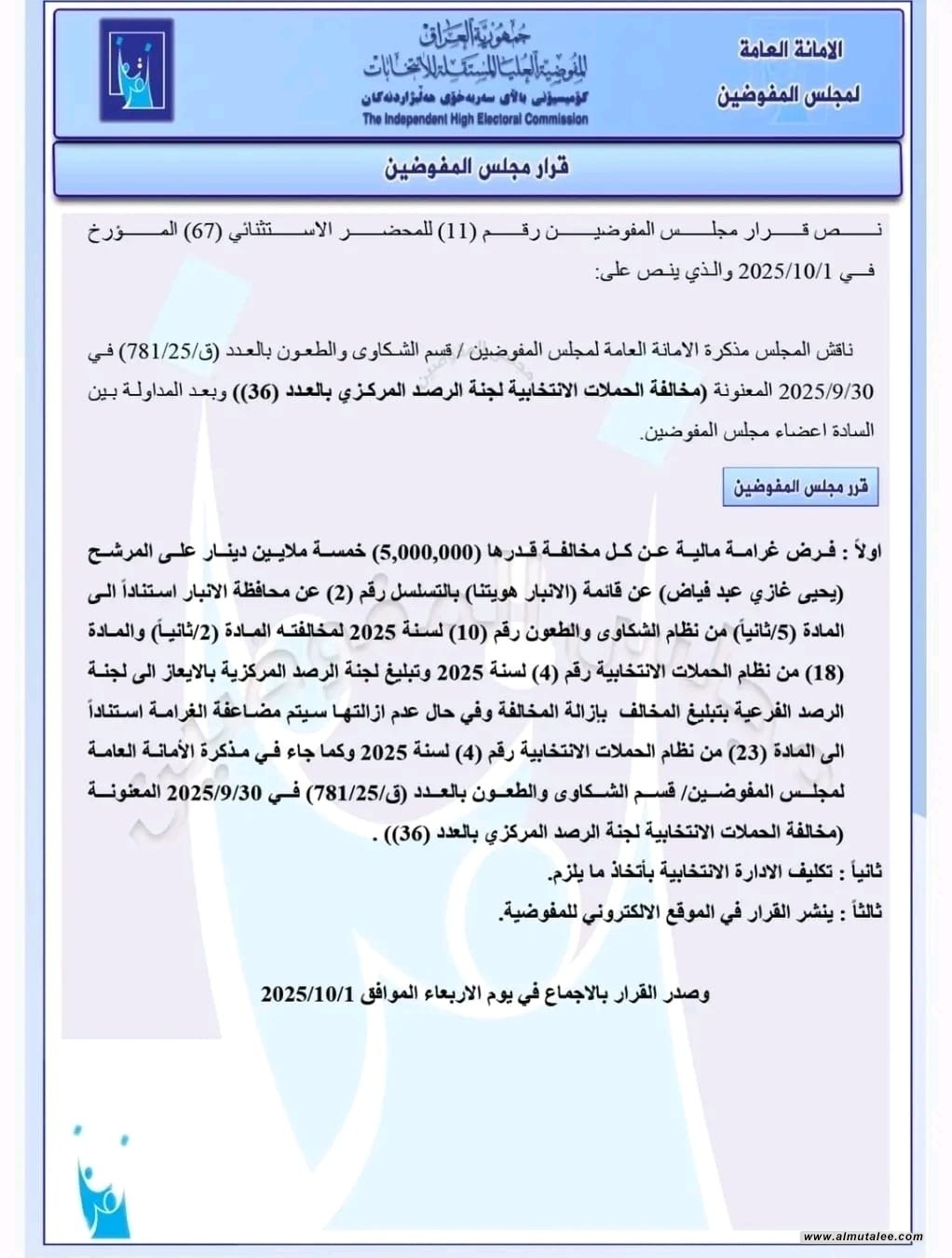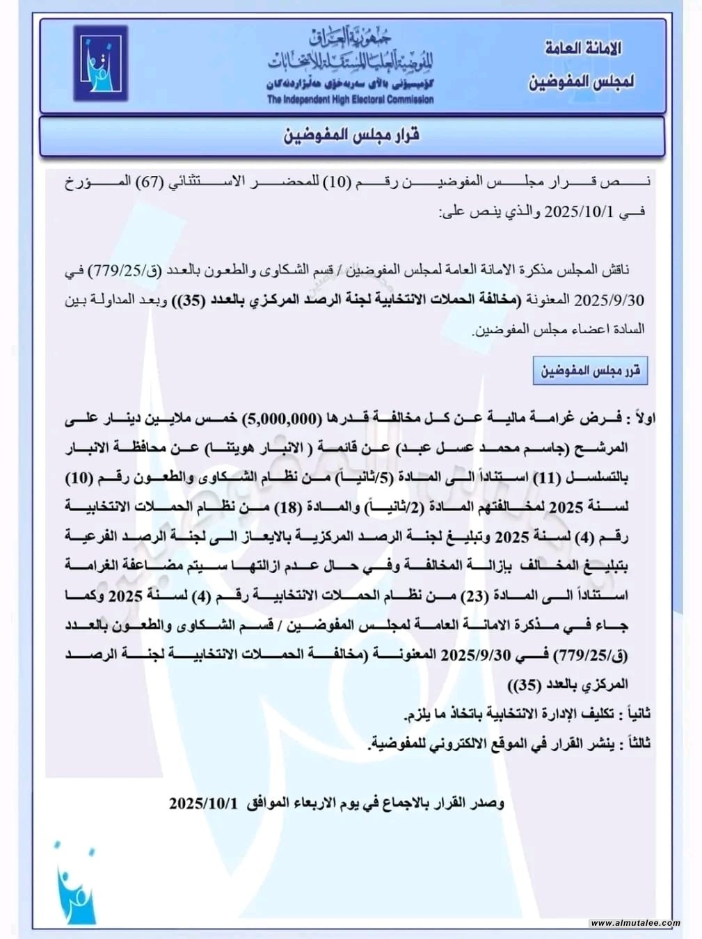 بالوثائق... المفوضية تُغرم مرشحين بالأنبار بسبب خرق ضوابط الحملات الانتخابية