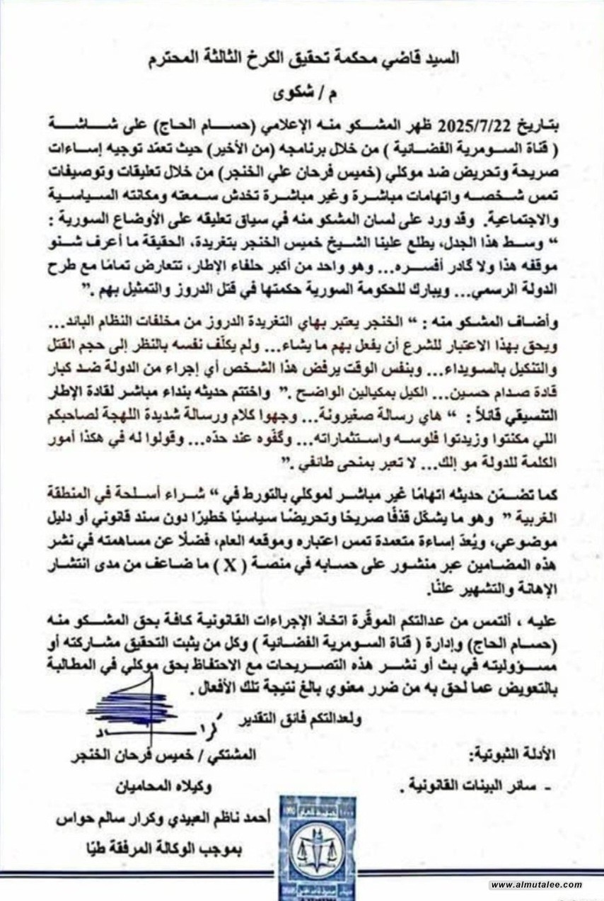 اظهرت وثيقة متداولة ،اليوم الأربعاء، رفع رئيس تحالف السيادة، خميس الخنجر، دعوى قضائية بحق الإعلامي حسام الحاج، بتهمة القذف والتشهير، على خلفية حلقة تلفزيونية بُثت على قناة السومرية وجه فيها الحاج انتقادات لمواقف الخنجر حول تداعيات الأزمة في السويداء، مع اتهامه بشراء وتهريب الأسلحة الى داخل الأراضي العراقية عبر الحدود المتاخمة لسوريا.