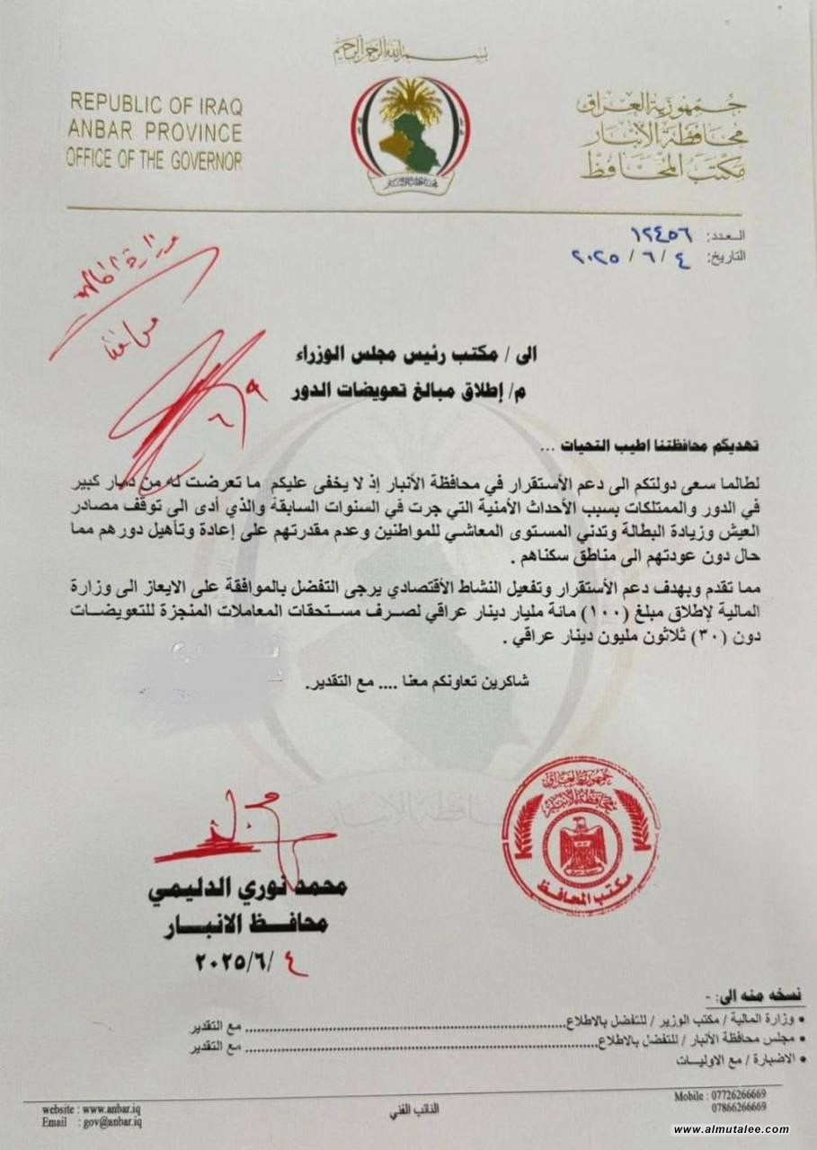 وأدناه وثيقة صادرة مكتب محافظ الأنبار وتلقتها "المطلع":