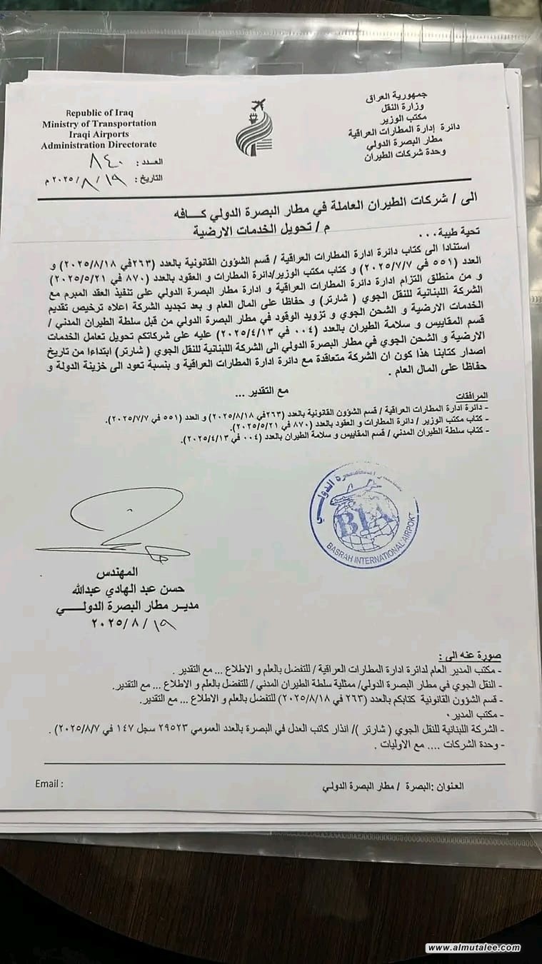 بالوثيقة... مطار البصرة الدولي ينقل إدارة المناولة والشحن لشركة لبنانية