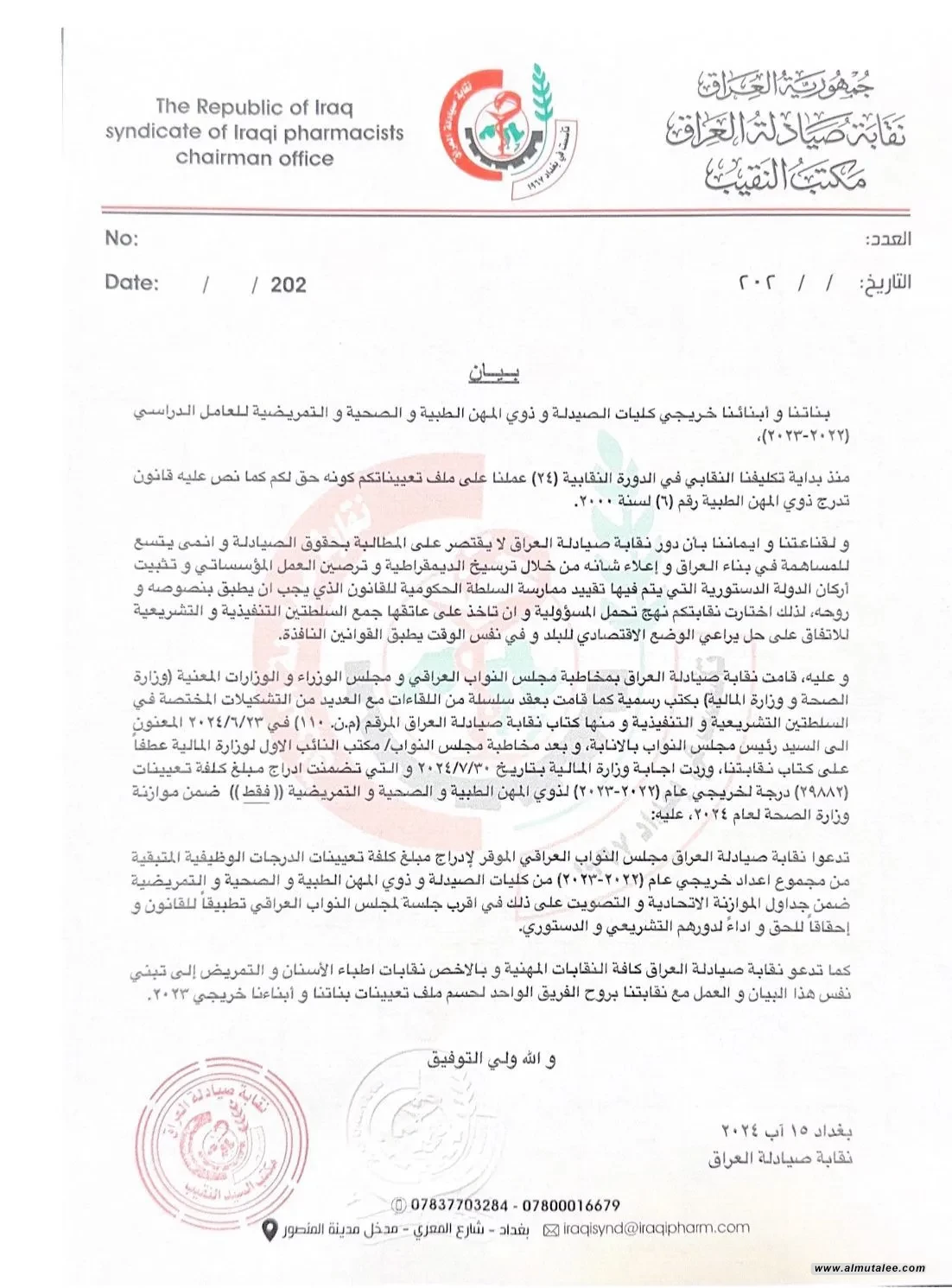وجهت نقابة الصيادلة في العراق، اليوم الخميس، دعوة إلى البرلمان لإدراج كلف التعيينات المتبقية.