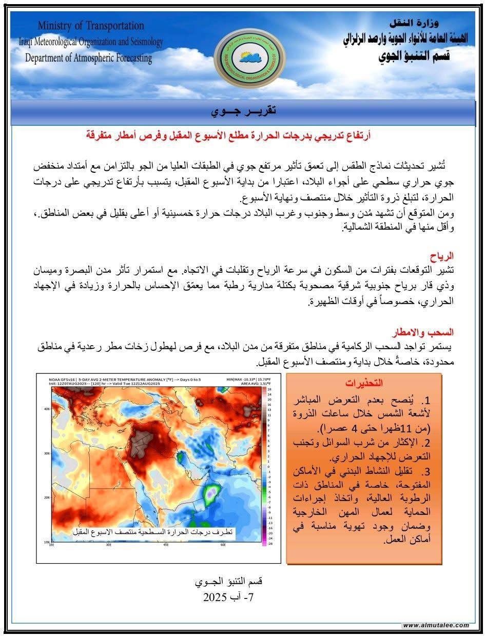 بداية الأسبوع المقبل... درجات حرارة مرتفعة في العراق والأنواء تطلق تحذيرات