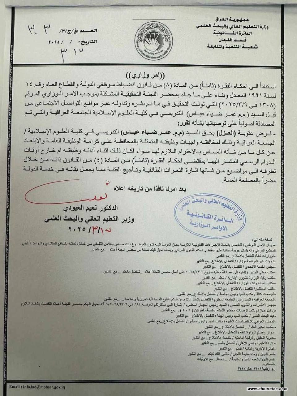 بسبب اثارته النعرات الطائفية .. وزير التعليم يعزل تدريسي بالجامعة العراقية