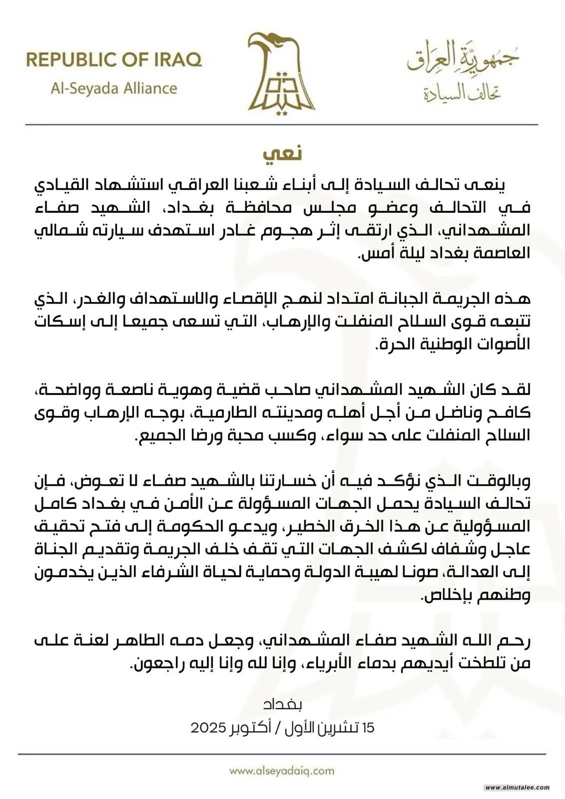 بعد اغتيال المشهداني... السيادة: نحمل الجهات المسؤولة عن الأمن ببغداد كامل المسؤولية
