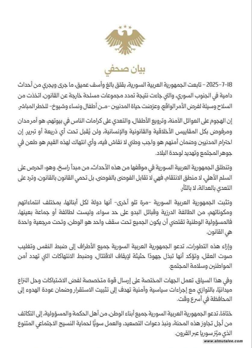ودعت الرئاسة جميع الأطراف إلى ضبط النفس وتغليب صوت العقل، مؤكدة العمل على إجراءات سياسية وأمنية لضمان عودة الاستقرار سريعًا إلى السويداء.