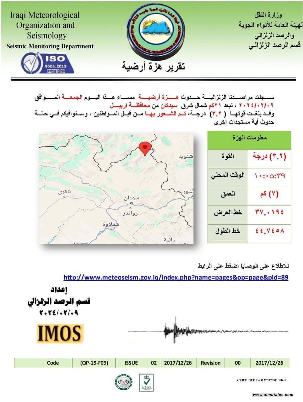 دەستەی کەشناسی و بومەلەرزە زانی عێراق رایگەیاند بوومەلەرزەیەک بە گوڕی (3.2) پلەی رێختەر لە باکوری ڕۆژهەڵاتی سیدەکان، لە پارێزگای هەولێر ڕوویدا.