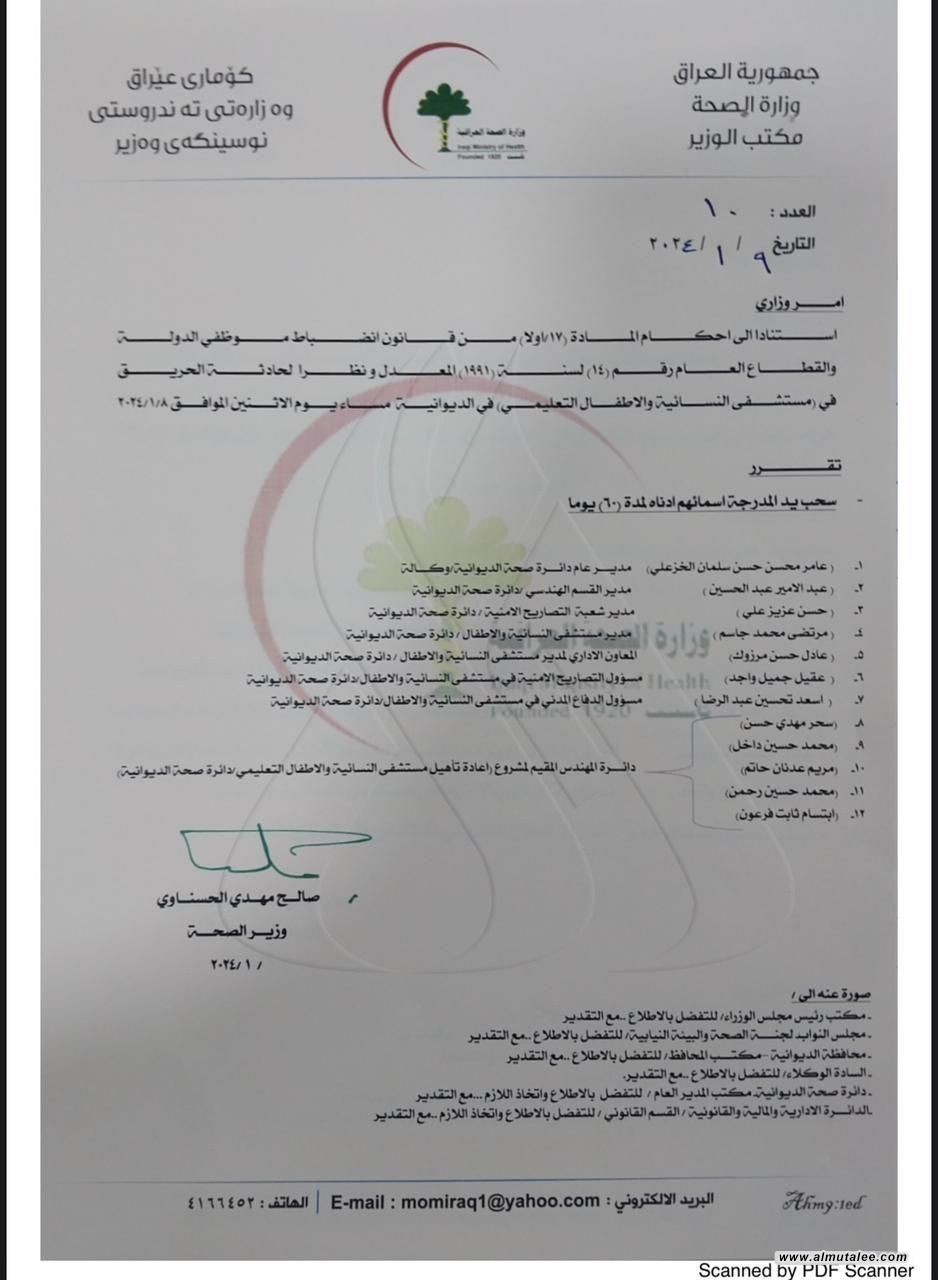 رۆژی سێشەممە، 9-1-2024، ساڵح مەهدی حەسناوی، وەزیری تەندروستیی عێراق بڕیاری بۆ دەستپێلەکارکێشانەوەی 12 کەس لە بەڕێوەبەرایەتیی تەندروستیی پارێزگای دیوانیە دەرکرد.