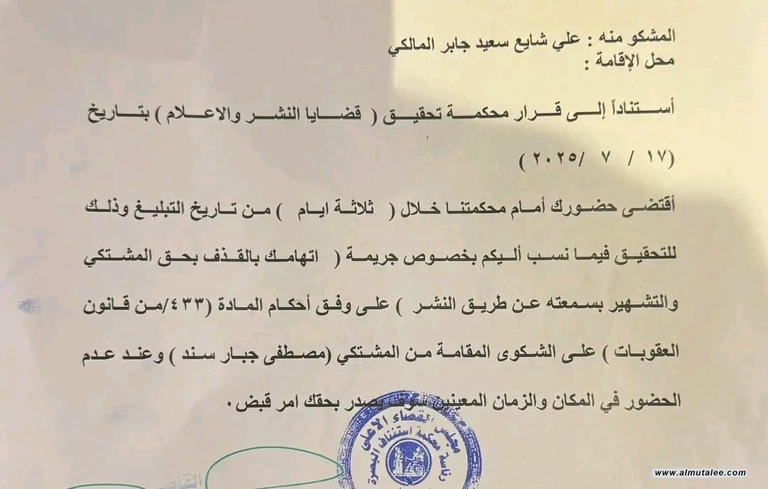 بەڵگەنامە... دادگای بەسرە بانگهێشتی عەلی شیاع دەکات بە تۆمەتی ناوزڕاندنی مستەفا سەنەد