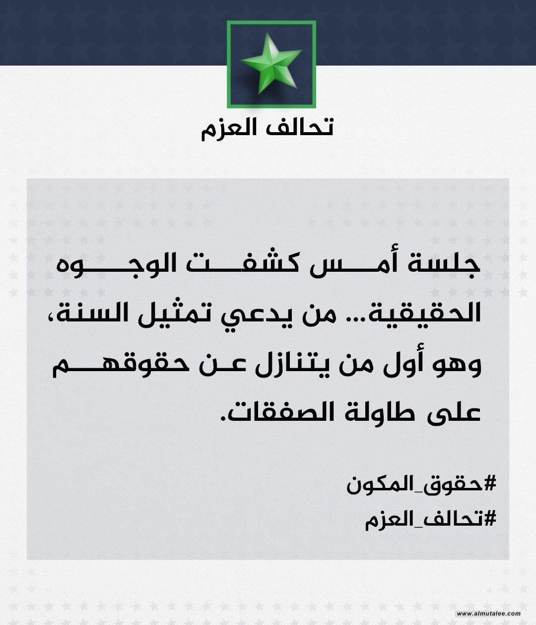 تحالف العزم: جلسة البرلمان الأخيرة كشفت المتاجرين بحقوق السنة