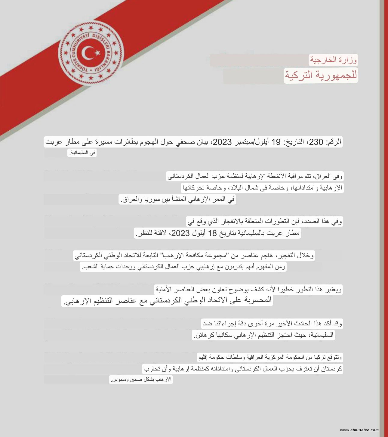 أصدرت وزارة الخارجية التركية ،اليوم الثلاثاء، بيانًا خطيرًا بشأن قصف مطار عربت في السليمانية، حيث اتهمت بشكل صريح تعاون بعض الأجهزة الأمنية في السليمانية بالتعاون مع حزب العمال الكردستاني، مستدلة بذلك على صحة اجراءاتها ضد السليمانية التي وصفتها بأنها اصبحت مختطفة لدى حزب العمال الكردستاني.