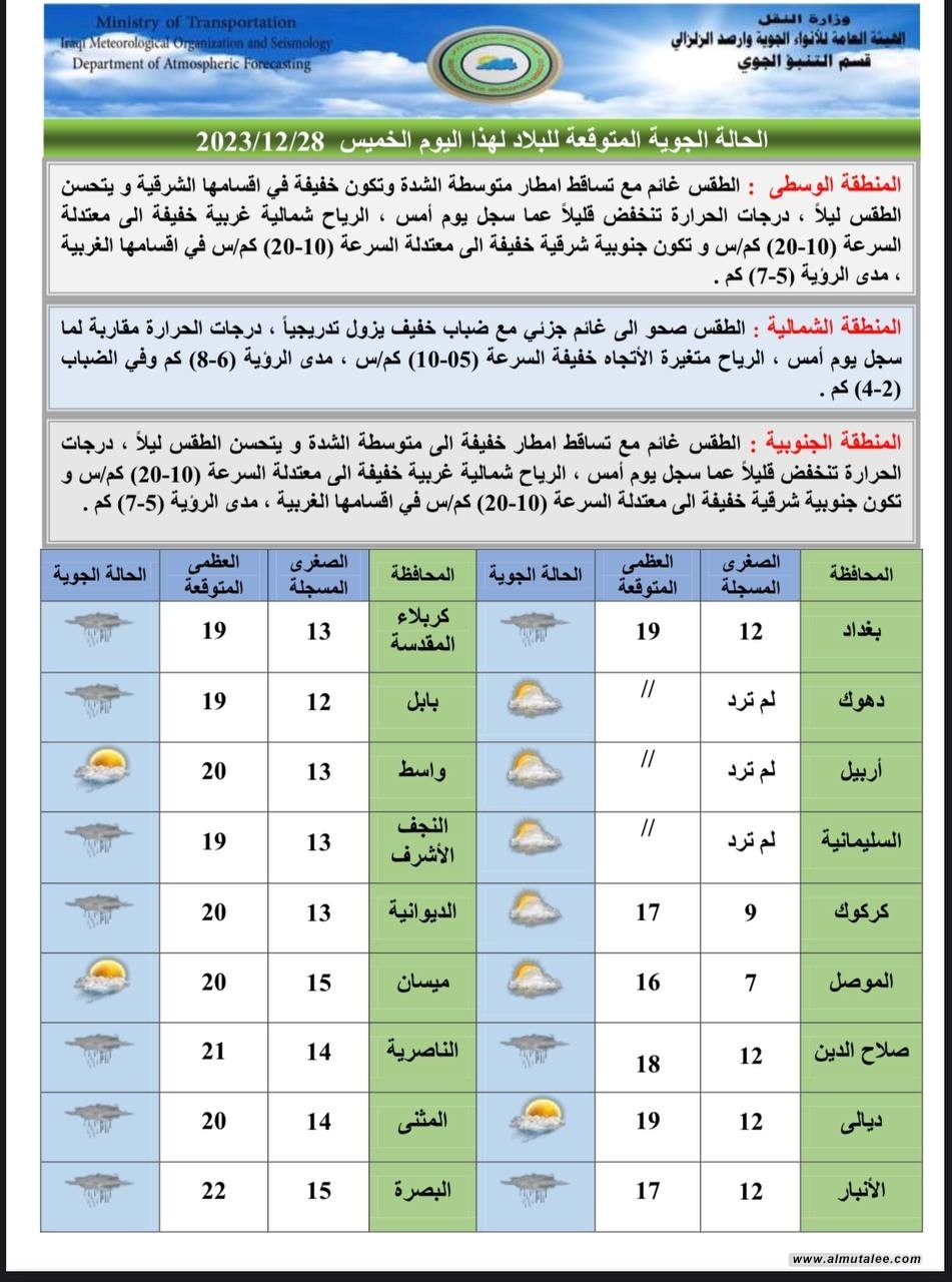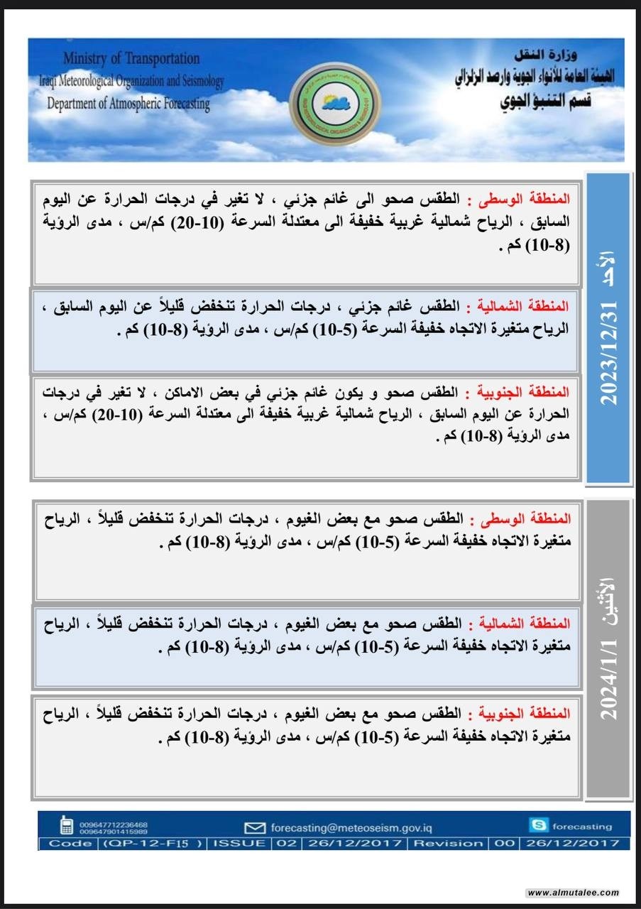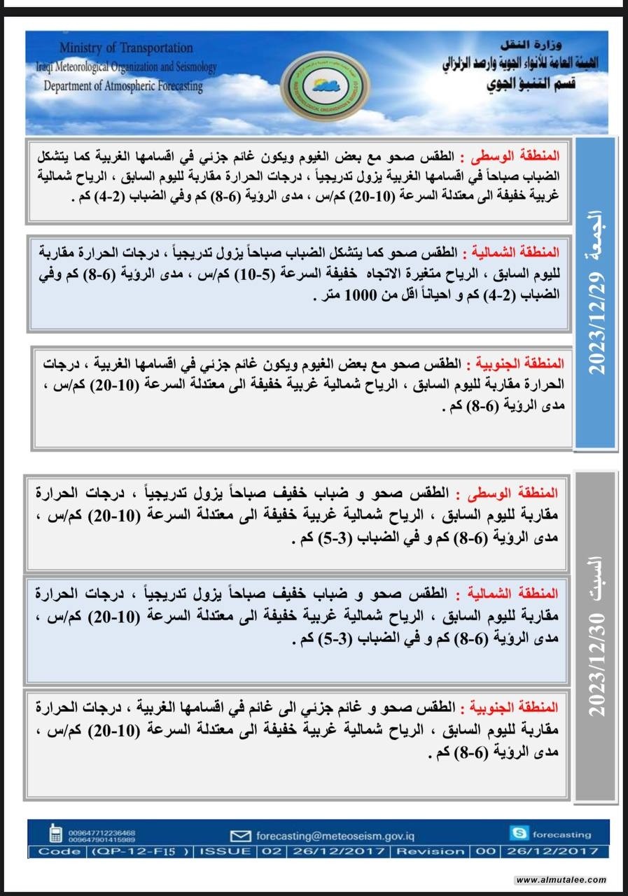 اعلنت هيئة الأنواء الجوية، اليوم الخميس، حالة الطقس في البلاد للأيام المقبلة، فيما توقعت تصاعداً للضباب وانخفاضاً في درجات الحرارة.
