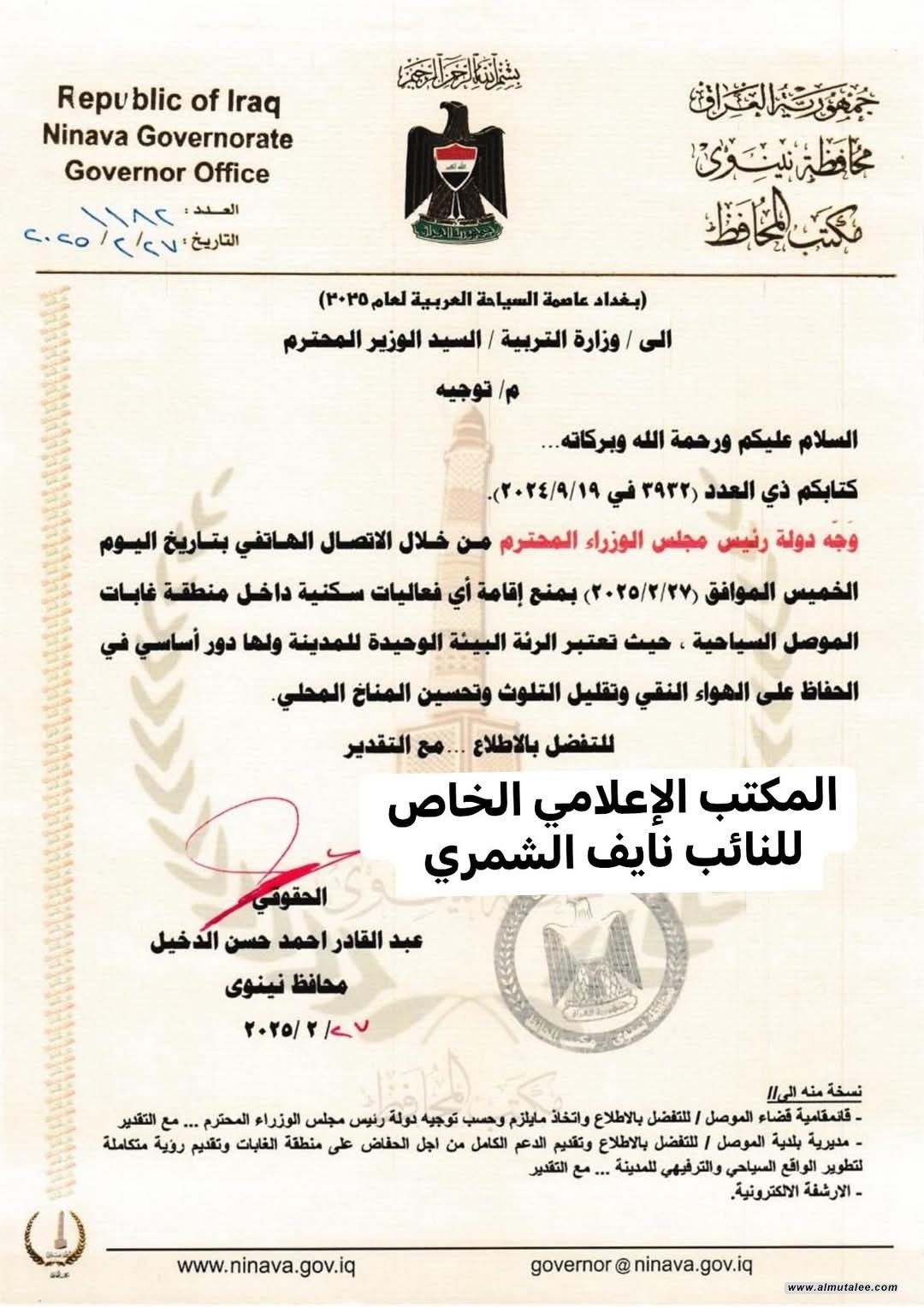 وقال محافظ نينوى، في كتاب الى وزارة التربية، تلقته "المطلع"، ان:"السوداني وجه من خلال الاتصال الهاتفي ؛اليوم الخميس، بمنع إقامة أي فعاليات سكنية داخل منطقة غابات الموصل السياحية، حيث تعتبر الرئة البيئية الوحيدة للمدينة ولها دور أساسي في الحفاظ على الهواء النقي وتقليل التلوث وتحسين المناخ المحلي".