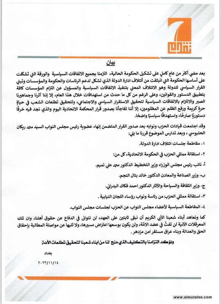 وتابع "اجتمعت قيادات الحزب ونوابه بعد صدور القرار المتضمن إنهاء عضوية رئيس مجلس النواب محمد ريكان الحلبوسي، وبعد تدارس الموضوع قررنا ما يلي: