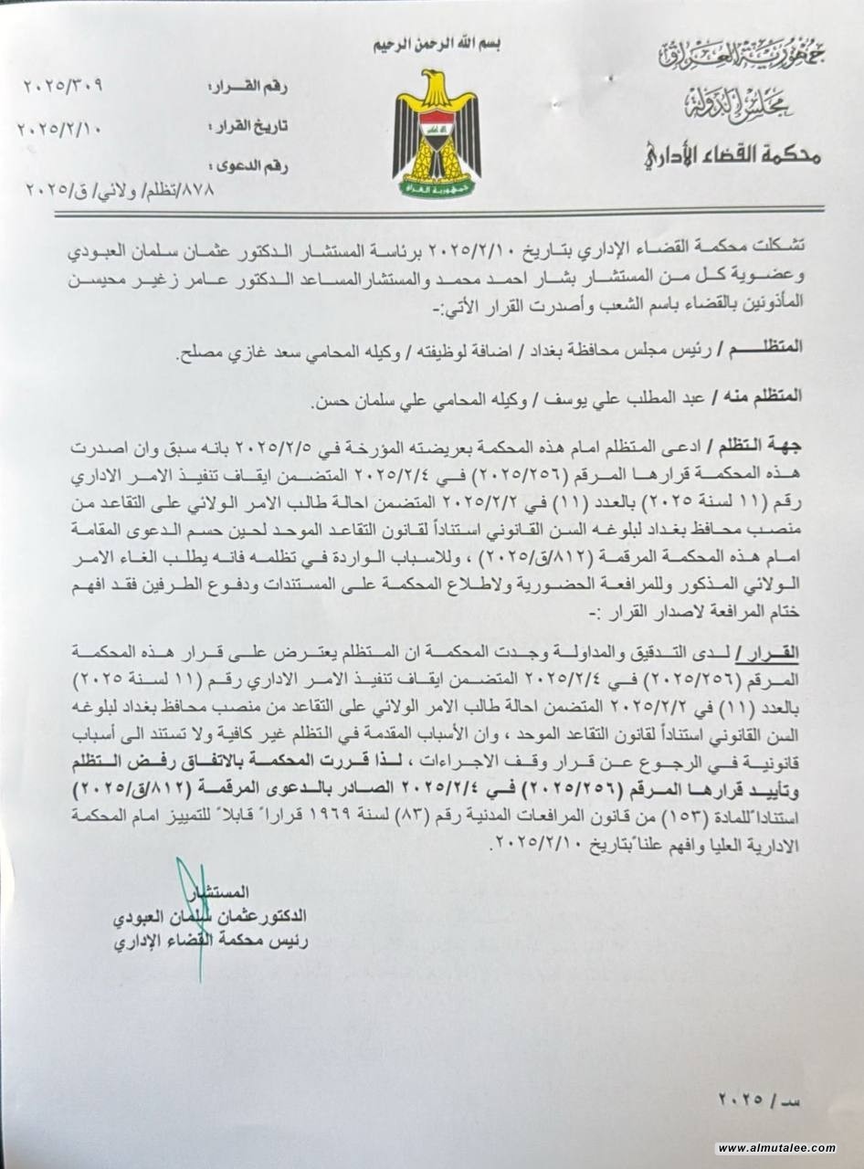 دادگای کارگێڕی تانەکەی قەیسی ڕەتدەکاتەوە و عەبدولموتەلیب عەلەوی وەک پارێزگاری بەغدا دەهێڵێتەوە