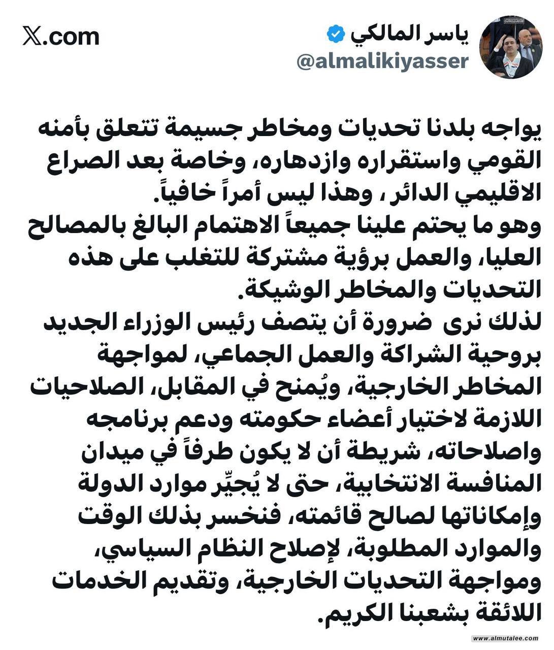 وأضاف: "‏لذلك نرى ضرورة أن يتصف رئيس الوزراء الجديد بروحية الشراكة والعمل الجماعي، لمواجهة المخاطر الخارجية، ويُمنح في المقابل، الصلاحيات اللازمة لاختيار أعضاء حكومته ودعم برنامجه وإصلاحاته، شريطة أن لا يكون طرفاً في ميدان المنافسة الانتخابية، حتى لا يُجيِّر موارد الدولة وإمكاناتها لصالح قائمته، فنخسر بذلك الوقت والموارد المطلوبة، لإصلاح النظام السياسي، ومواجهة التحديات الخارجية، وتقديم الخدمات اللائقة بشعبنا الكريم".