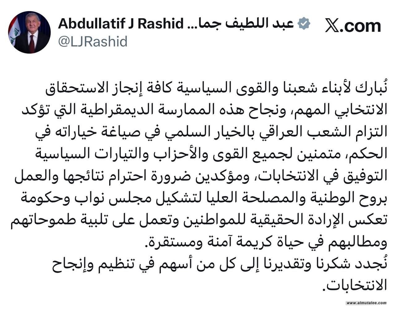 وقال رئيس الجمهورية في تدوينه على منصة (إكس)، تابعتها وكالة "المطلع"، إنه:"نُبارك لأبناء شعبنا والقوى السياسية كافة إنجاز الاستحقاق الانتخابي المهم، ونجاح هذه الممارسة الديمقراطية التي تؤكد التزام الشعب العراقي بالخيار السلمي في صياغة خياراته في الحكم".