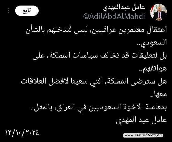 وقال عبد المهدي في تدوينة تلقتها "المطلع"، انه: