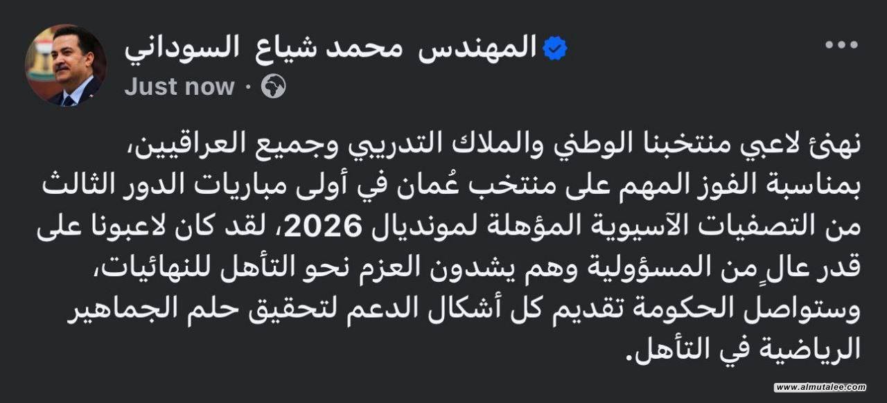هنأ رئيس الوزراء محمد شياع السوداني، اليوم الخميس، منتخبنا الوطني بفوزه على نظيره العماني.
