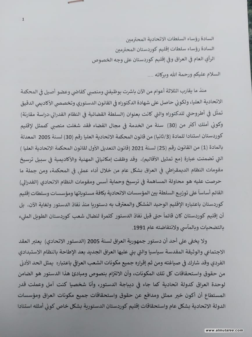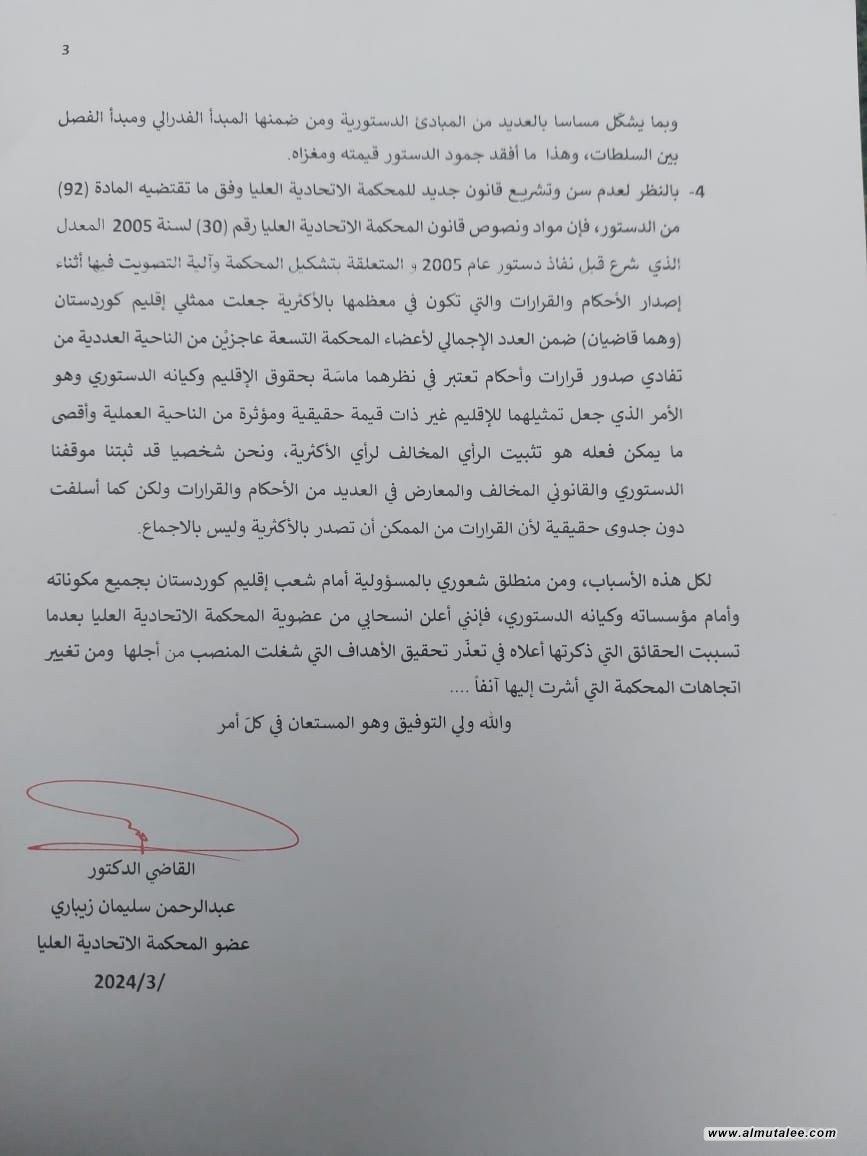 وتابع: "لكن وبعد مرور ما يقارب الثلاث سنوات على إشغالي للمنصب وتوالي صدور القرارات من المحكمة الاتحادية العليا بتشكيلتها الجديدة فقد توصلت إلى قناعة ذاتية أن وجودي واستمراري كقاضي في المحكمة لا يحقق الغاية المبتغاة من شغلي لهذا المنصب وهي المساهمة في الحفاظ على المبادئ والأسس التي جاء بها الدستور، وبشكل أخص وجدت نفسي في موقع أصبحت فيها جهودي وإمكانياتي العلمية والمهنية عاجزة عن تحقيق غايتها في الدفاع عن مصالح إقليم کوردستان بصفته إقليما دستوريا معترفا به في العديد من مواد الدستور الاتحادي. ولعل أن أهم أسباب الوصول لهذه القناعة تتمثل فيما يلي: