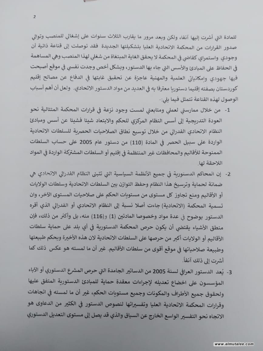 2- إن المحاكم الدستورية في جميع الأنظمة السياسية التي تتبنى النظام الفدرالي الاتحادي هي ضمانة لحماية وترسيخ هذا النظام وحفظ التوازن بين السلطات الاتحادية وسلطات الولايات أو الأقاليم ومنع تجاوز كل مستوى من مستويات الحكم على صلاحيات المستوى الآخر، وان تسمية المحكمة الاتحادية جاءت أصلا نسبة إلى النظام الاتحادي أو الفدرالي الذي أقره الدستور بوضوح في عدة مواد وخصوصا المادتين (1) و (116) منه بل وأكثر من ذلك، فإن منطق الأشياء يقتضي أن يكون حرص المحكمة الدستورية في أي بلد على حماية سلطات الأقاليم أو الولايات أكبر من حرصها على السلطات الاتحادية لان هذه الأخيرة وبحكم طبيعتها وطبيعة صلاحياتها في موقع أقوى من سلطات الأقاليم. غير أن ما لمسته هو عكس ذلك كما أشرت إلى ذلك آنفاً.