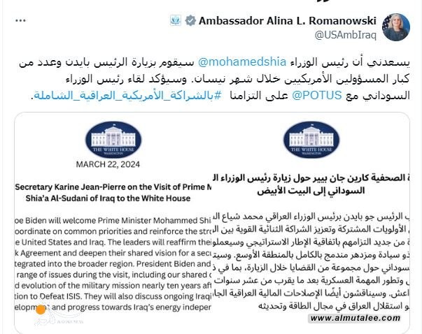 وقالت رومانسكي في منشور على منصة أكس تابعتها “المطلع” أنه: "يسعدني أن يجري رئيس الوزراء محمد شياع السوداني زيارة الى الرئيس بايدن وعدد من كبار المسؤولين الأمريكيين خلال شهر نيسان".