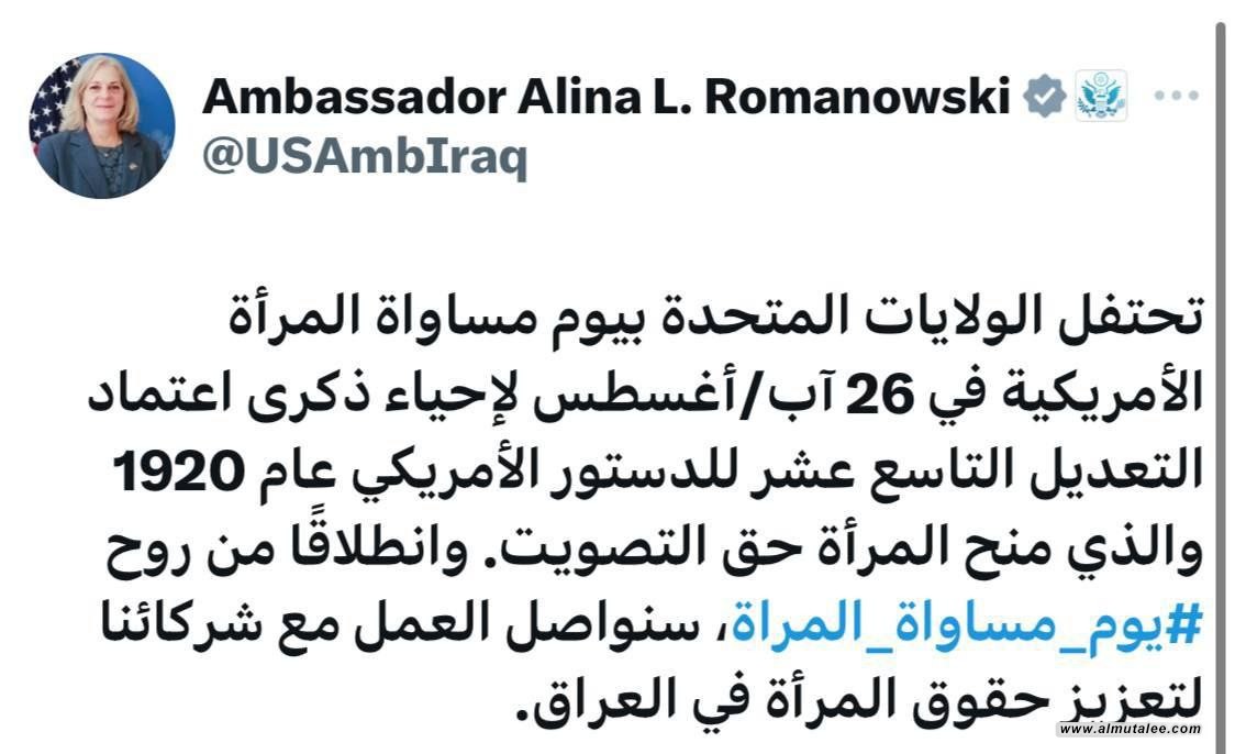 قالت السفيرة الأمريكية في بغداد "إلينا رومانويسكي"، اليوم الإثنين، إن: "بلادها ستواصل العمل مع الشركاء لتعزيز حقوق المرأة في العراق، وذلك بمناسبة يوم مساواة المرأة الأمريكية".