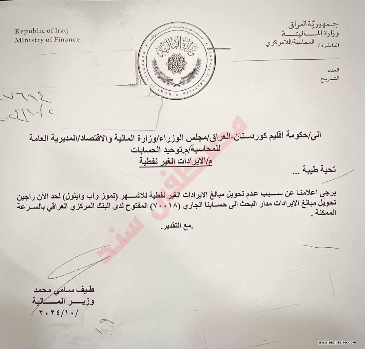 سند يكشف وثيقة من وزارة المالية: الإقليم تأخر بتسديد الإيرادات غير النفطية